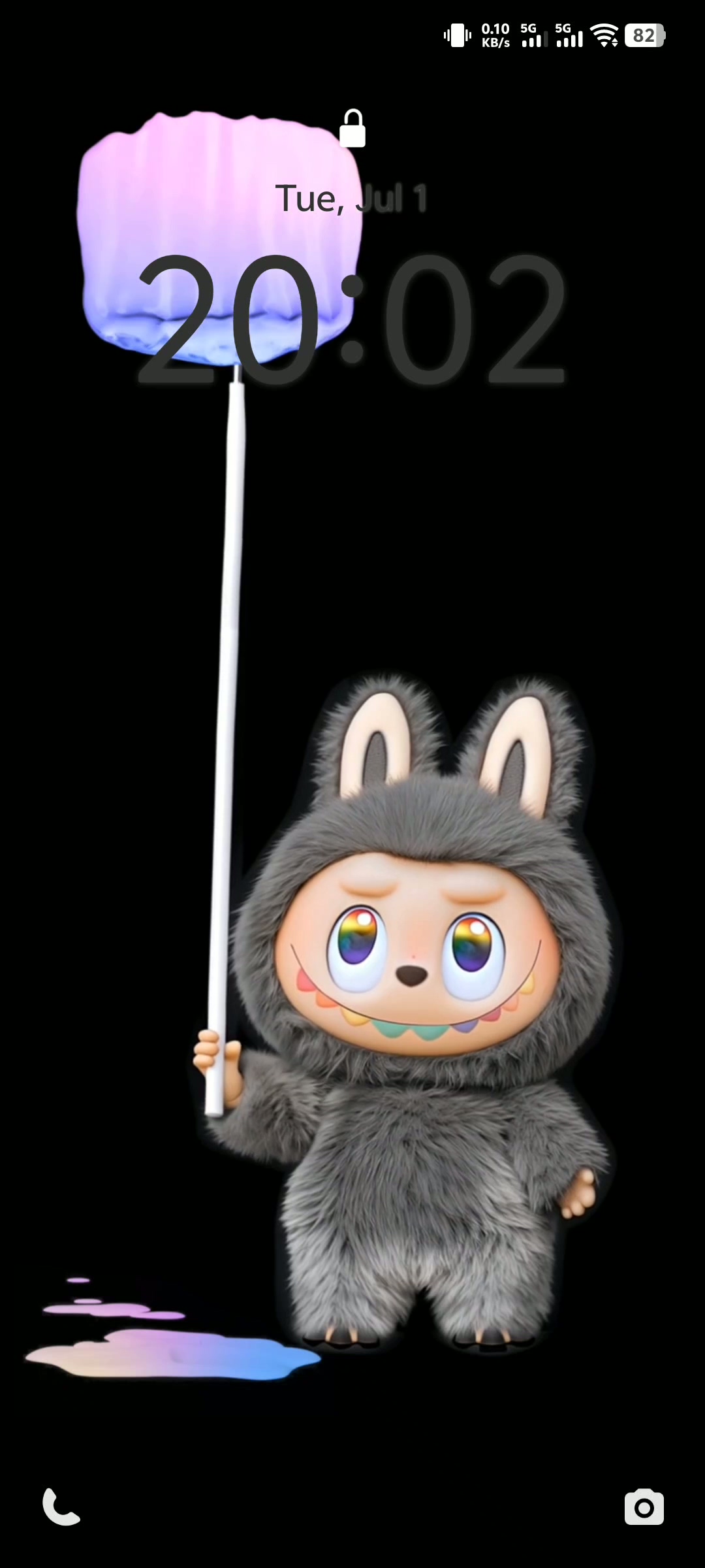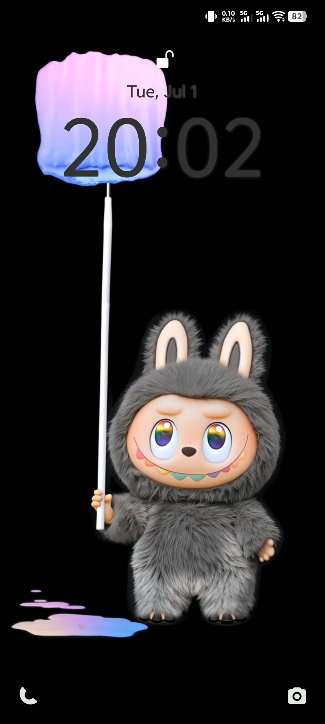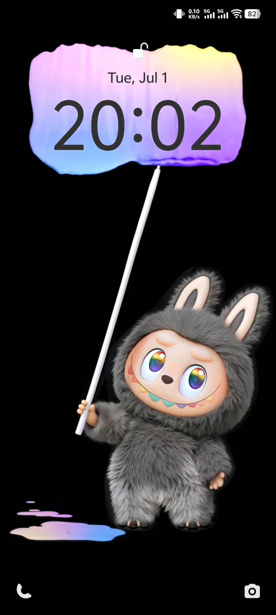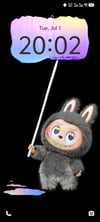 Labubu stands at the bottom of the screen, wielding a long paintbrush that sweeps across a sleek black background. The gradient paint effect—soft pinks, purples, and blues—drips and pools playfully, creating a dreamy, artistic vibe that enhances your phone’s lock screen. The time display integrates seamlessly with the animation, making it both functional and fun.