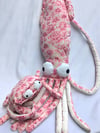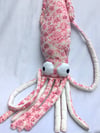This one-of-a-kind squid is made of 100% upcycled fabric, in this case a smooth cotton with a pattern of 70s-style pink and white flowers, with white cotton for the underside and eyes. (The pupils are made of felt, and handsewn, not embroidered.) Each one is unique--no exact colour combination is repeated and there are only limited amounts of each upcycled fabric in any case--and has its own personality. Because of seam holes in the vintage fabric, it has been embroidered with simple visible mending in matching pink floss. The squid is about 4' long (or 120cm), but half of that length is noodly appendages. This squid also has a matching crab, available here!
