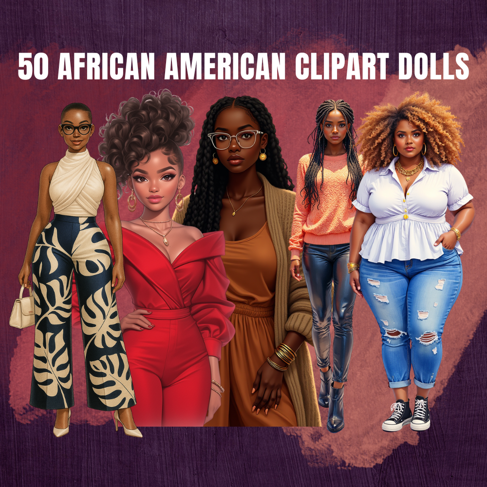 Introducing the Variety Pack Clipart Bundle! This collection features 50 stylish African American Dolls Clipart perfect for your crafty creations. Unleash your creativity with this beautiful and trendy Clipart Bundle. There are a variety of styles, poses, and images. Don't miss out on the opportunity to create stunning designs!