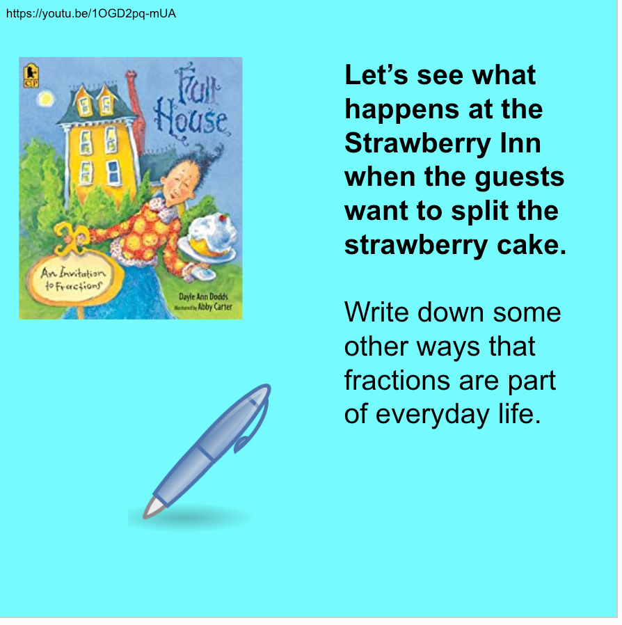 It shows simple fractions with examples and read aloud for Full House by Dayle Ann Dodds which can be used for a fraction discussion and project.