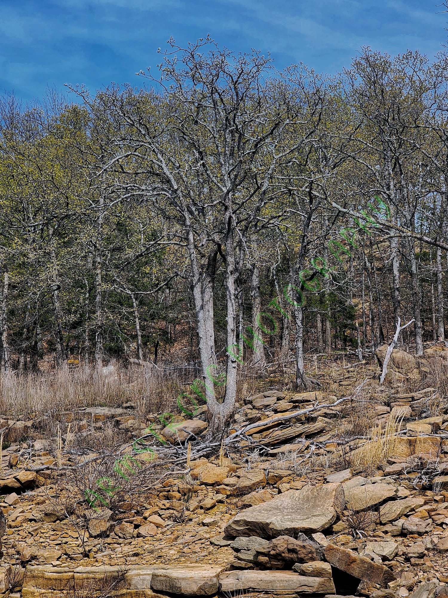 The leaves are falling off the trees that surround this limestone rock. This image is outside of Keystone Lake in Oklahoma. The beauty of the bare trees, knowing that something bright and glorious will come next year, is to be understood.