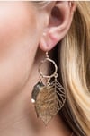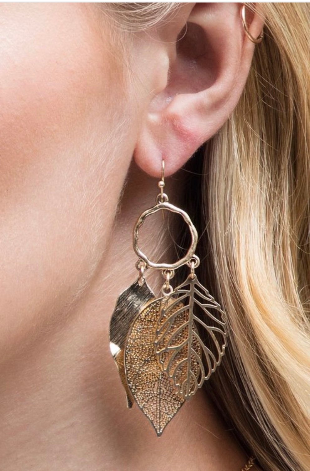 Three set filigree, hammered and satin metal leaf charms and textured metal hoop dangle with fish hook earrings