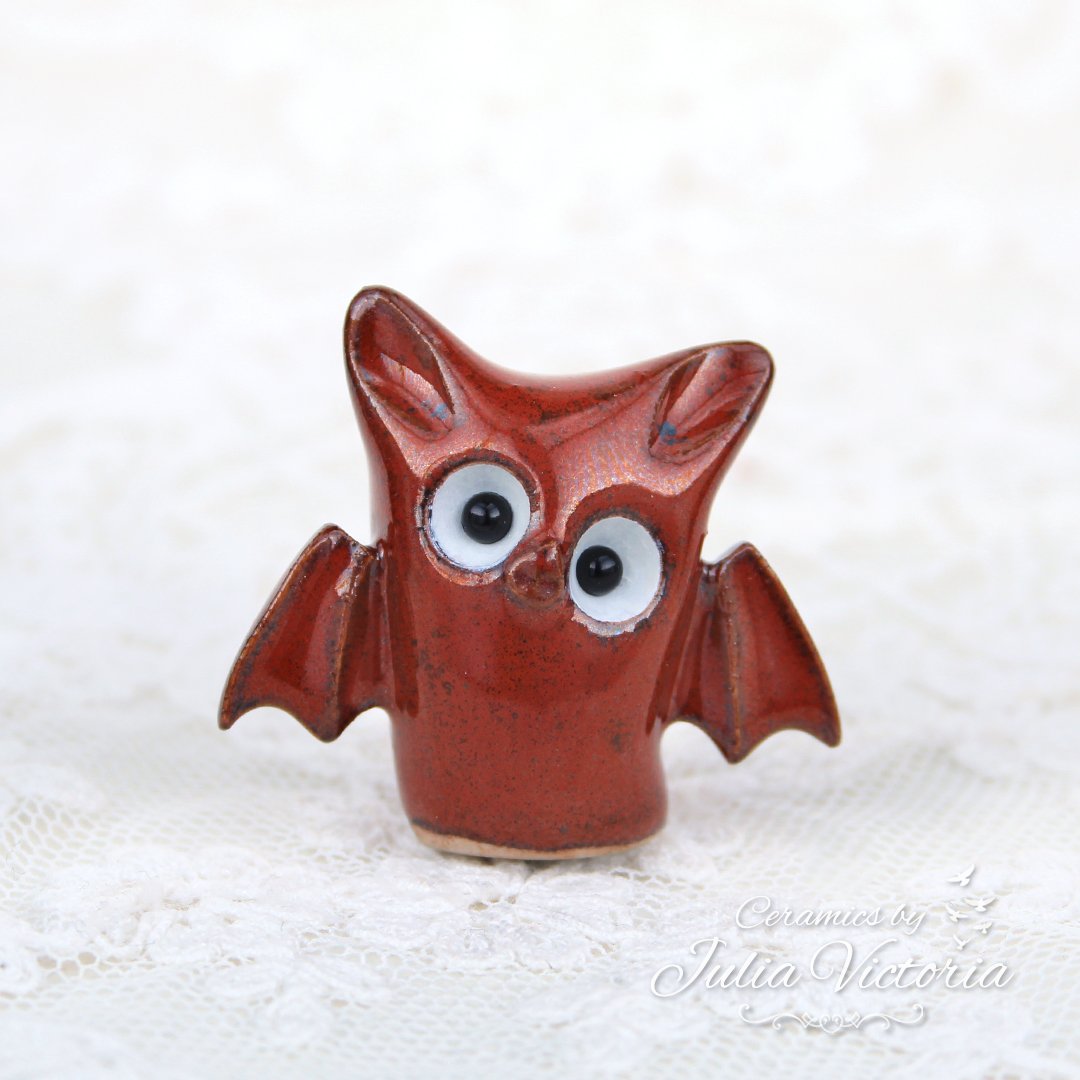 This cute little bat is looking for a new place to sleep. It is hand-sculpted in ceramics, glazed and painted by me