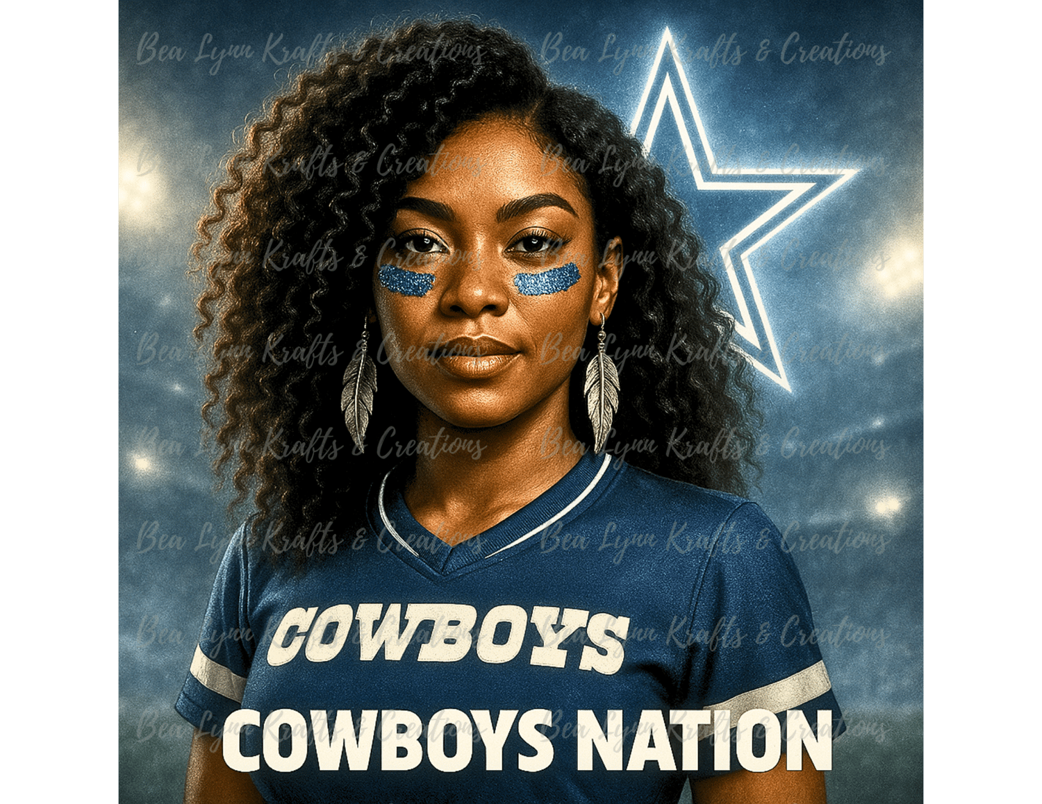 Show up for America’s Team with this bold and beautiful transparent PNG featuring a proud female Dallas Cowboys fan! With glittery blue face paint, feather earrings, and a fierce gaze that embodies Cowboys confidence, this digital artwork captures the spirit of “Cowboys Nation” in stunning detail. Perfectly formatted with a transparent background, this high-res image is ready to bring your apparel, tumblers, posters, and more to life.
