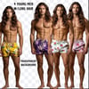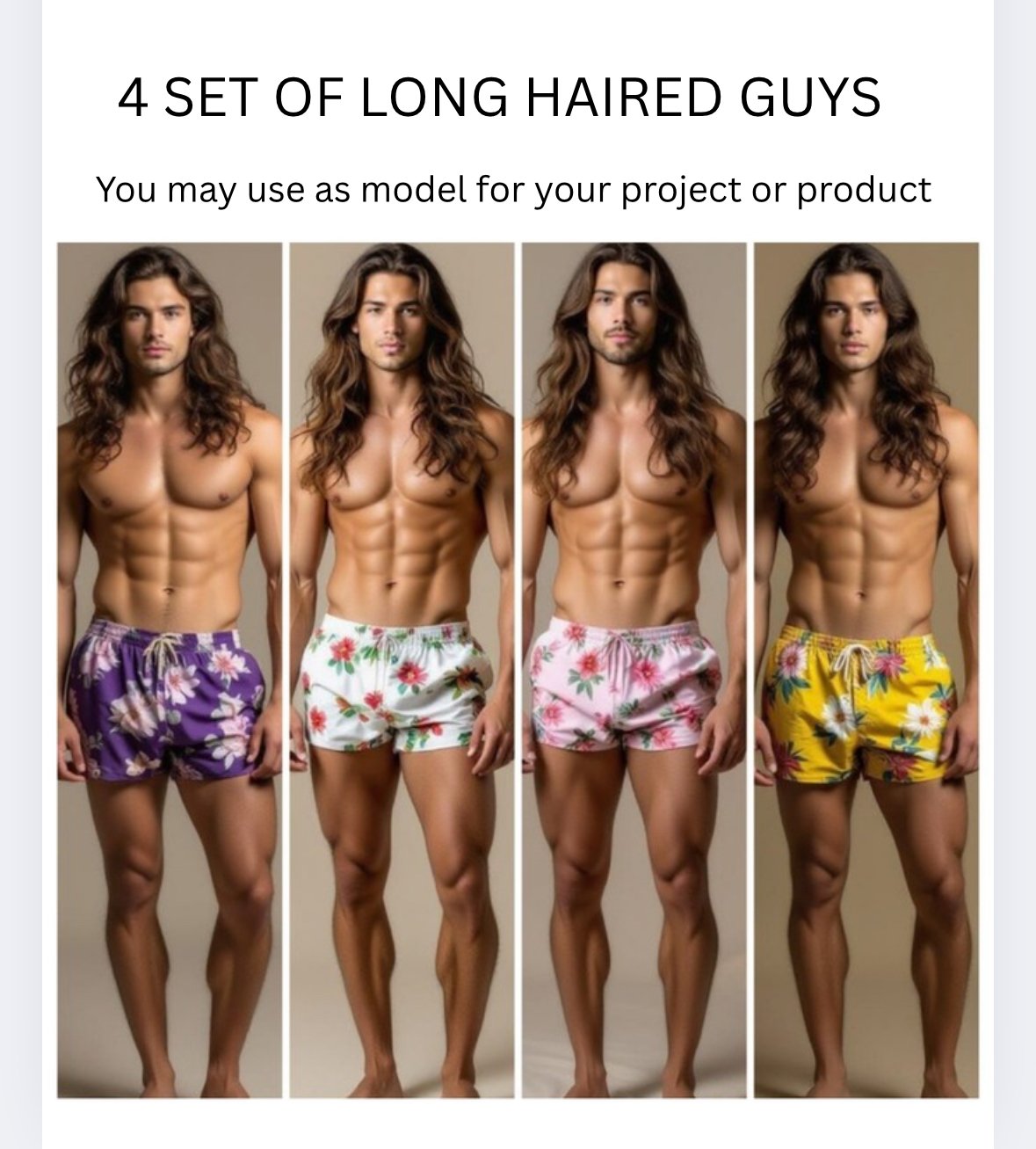 This product includes 4 high-resolution PNG clipart images of young men with long hair wearing tropical floral shorts. Each image comes with a transparent background and is saved at 4500 x 5400 pixels, 300 DPI — perfect for large-format printing, sublimation, and print-on-demand projects.