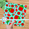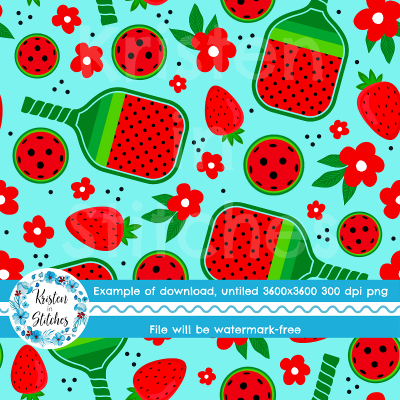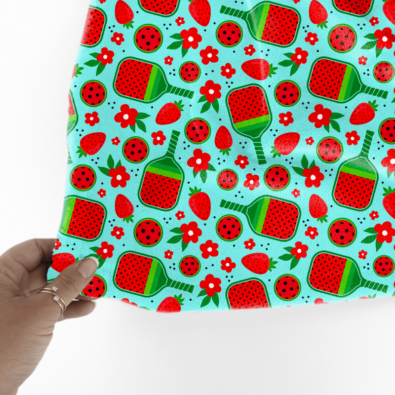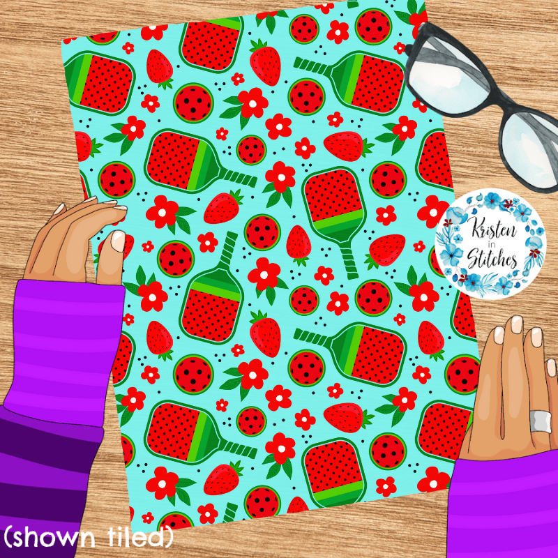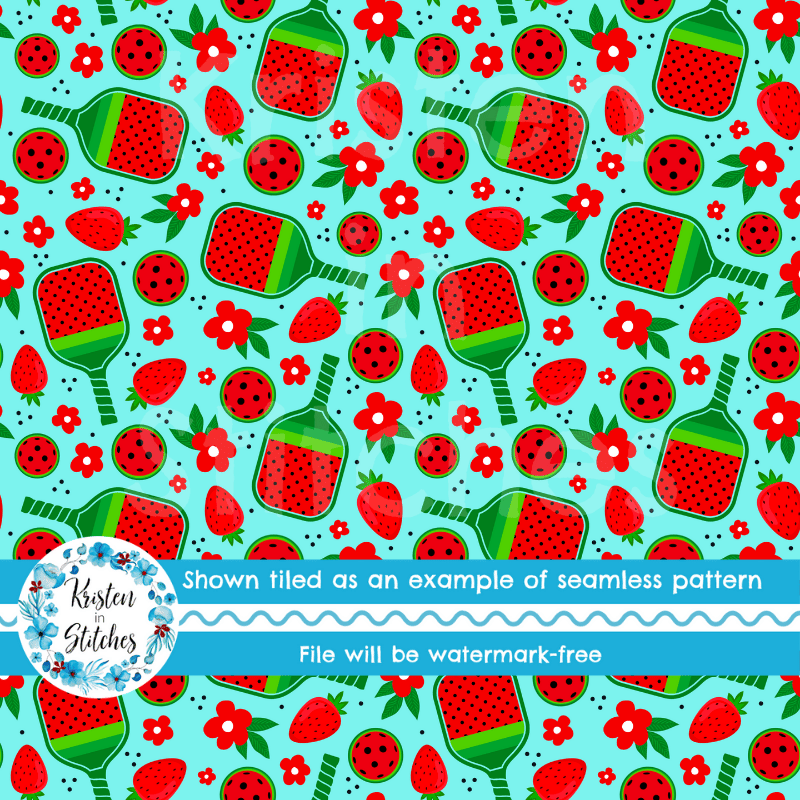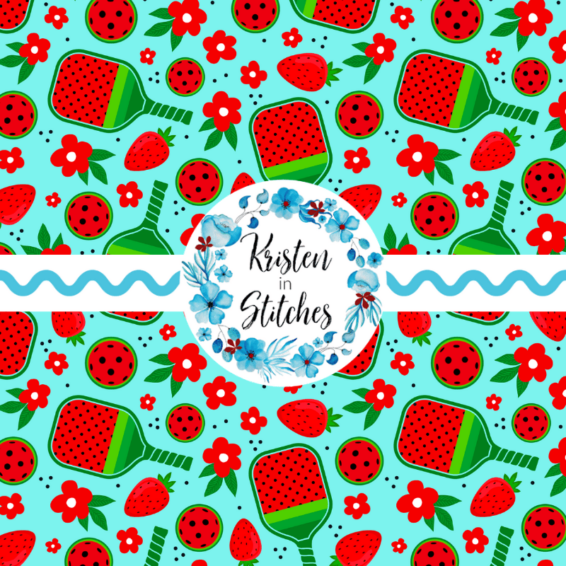 Red Strawberry Pickleball Seamless Pattern, Paddles and Balls, Blue