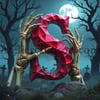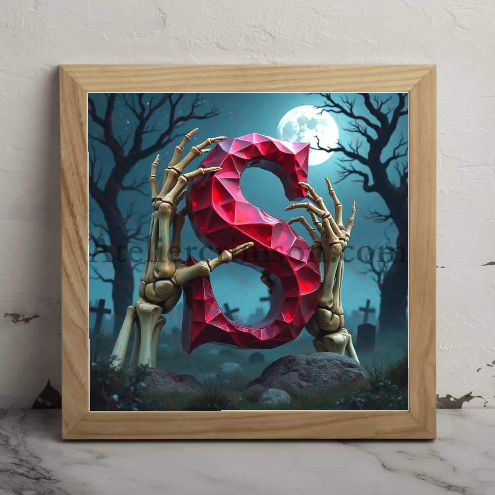 The letter S ruby halloween skull Discover our eerie alphabet series featuring photorealistic ruby letters and numbers. Each character, crafted from deep red gemstone, floats mysteriously in a misty graveyard. Skeletal hands frame these gleaming symbols against a moonlit, Halloween-inspired backdrop. Perfect for gothic design projects or seasonal decor inspiration!