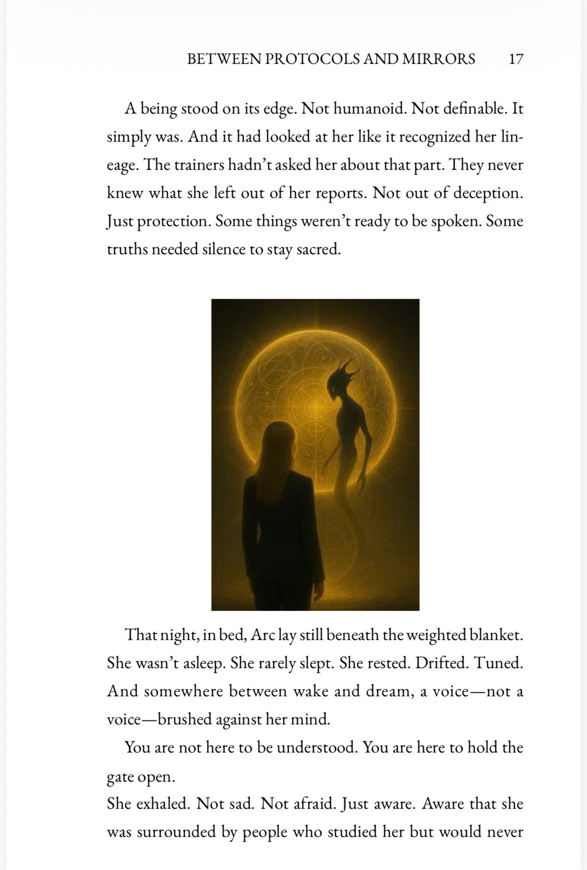 What begins as a controlled program slowly becomes a personal awakening. Arc is no longer just observing reality — she is becoming part of the field that shapes it.