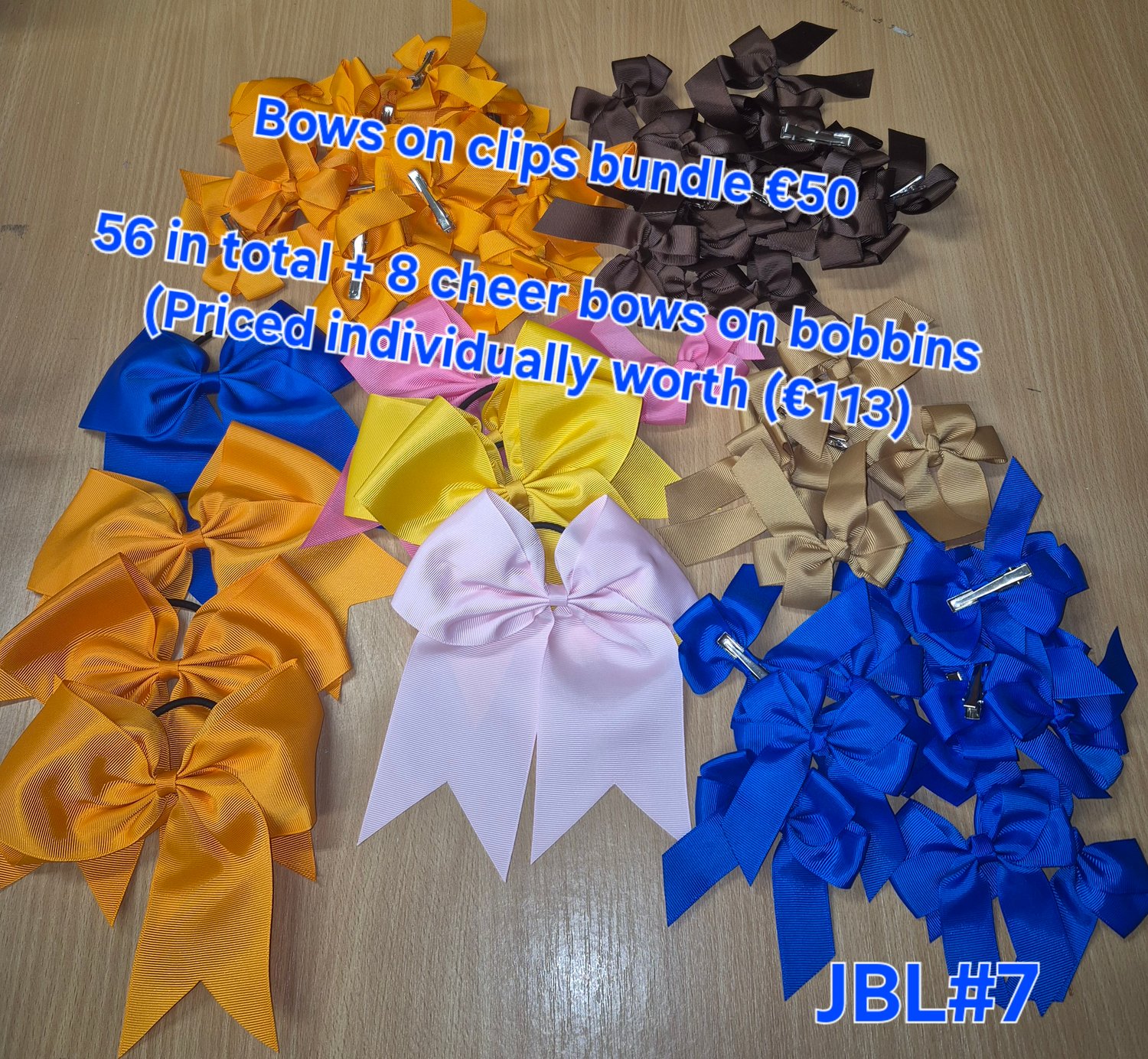 Contains 56 bows with clips and 8 cheer bows on bobbins