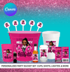 Each set is fully personalized to match your theme, featuring names, colors, or phrases on every item – including foam cups, goblet cups, shot glasses, mini bottles, and 6 coordinating stirrers to tie it all together!