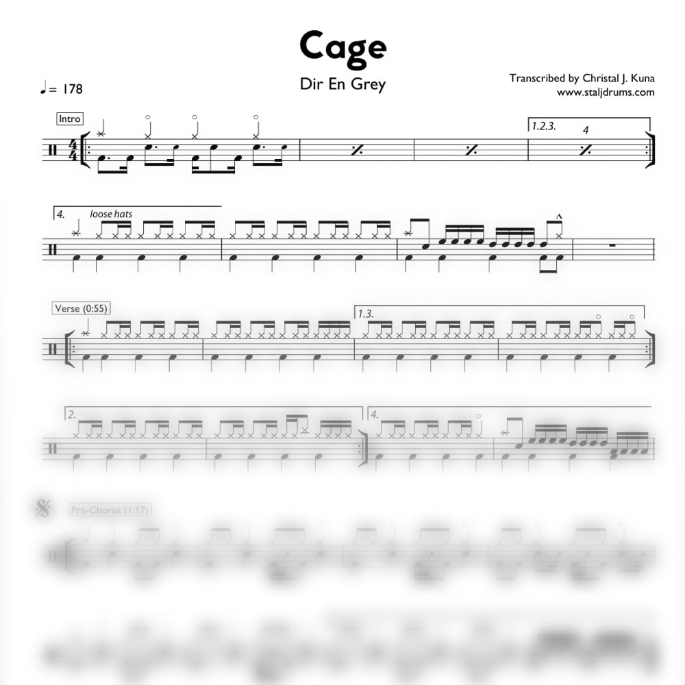 Drum sheet music for Cage by Dir En Grey, formatted by section and with timestamps.