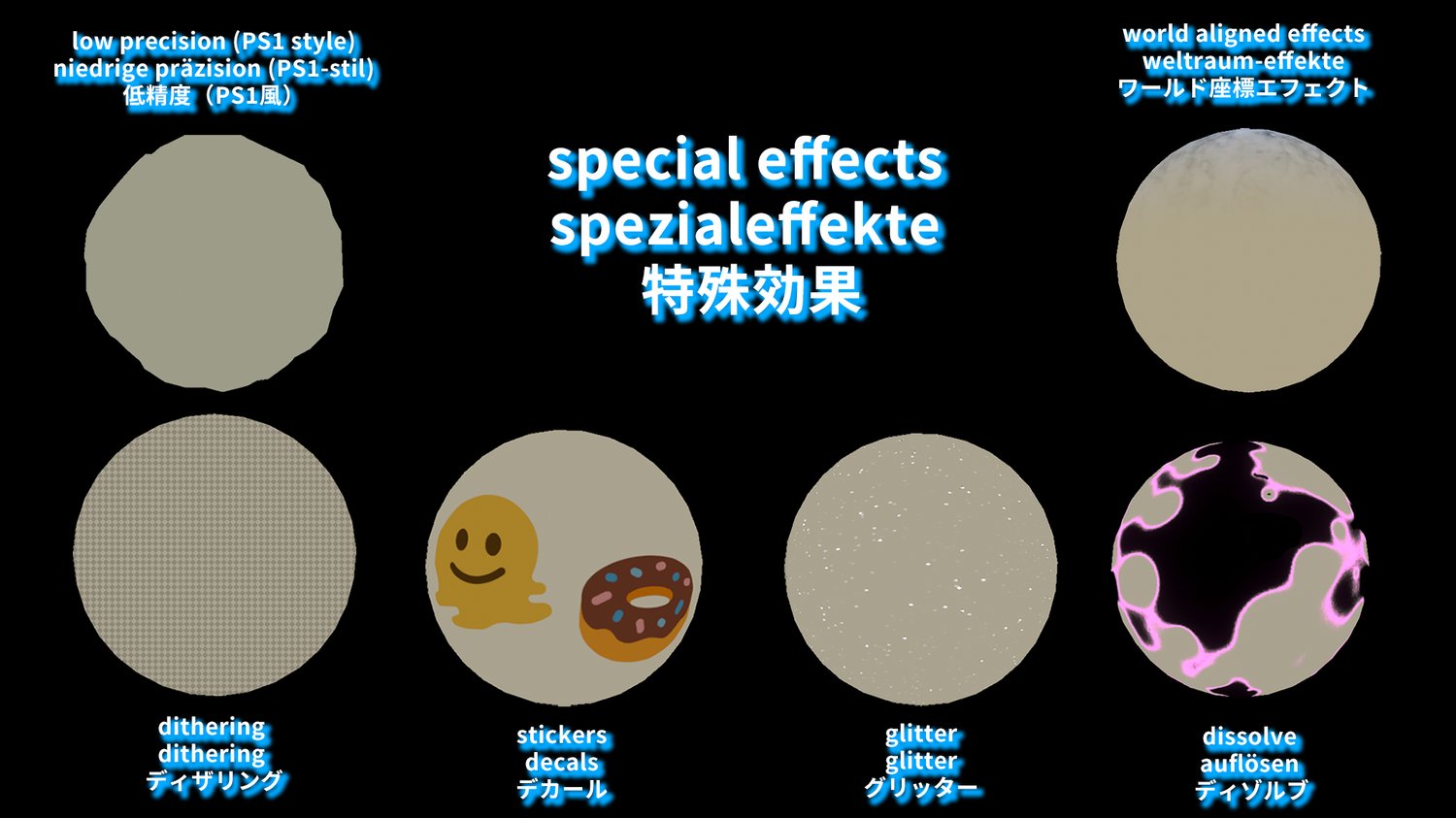 - Effects: Dissolve, Distance Fading, Mirror Detection, Pathing, Glitter, Iridescence, Shadow Textures, World Aligned Textures, Dithering, Touch Interactions, Flatten Model, Vertex Distortion, Low-Precision (PS1), Refraction, (Fake) Screen Space Reflections