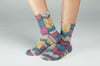Entire sock is worked flat and seamed along the top of the foot just prior to working the toe. Waste yarn is applied at selvedges to allow for a linked seam. The leg and top of foot are worked in ripple stitch pattern. The heel and sole of foot are worked as a plain bargello segment using the main ball of yarn. The toe is worked in the round as for an ordinary sock. Socks are mirror images of each other.