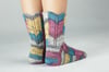 Excerpt from Bargello Knits: "My next adventure in socks was to continue the bargello segments onto the foot somehow. This project shows how to do it with long color change yarn. The stitch pattern adds to the fun."