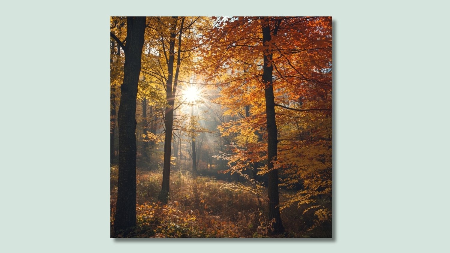 Golden autumn forest with sunlight streaming through trees; cozy, high-resolution printable art.