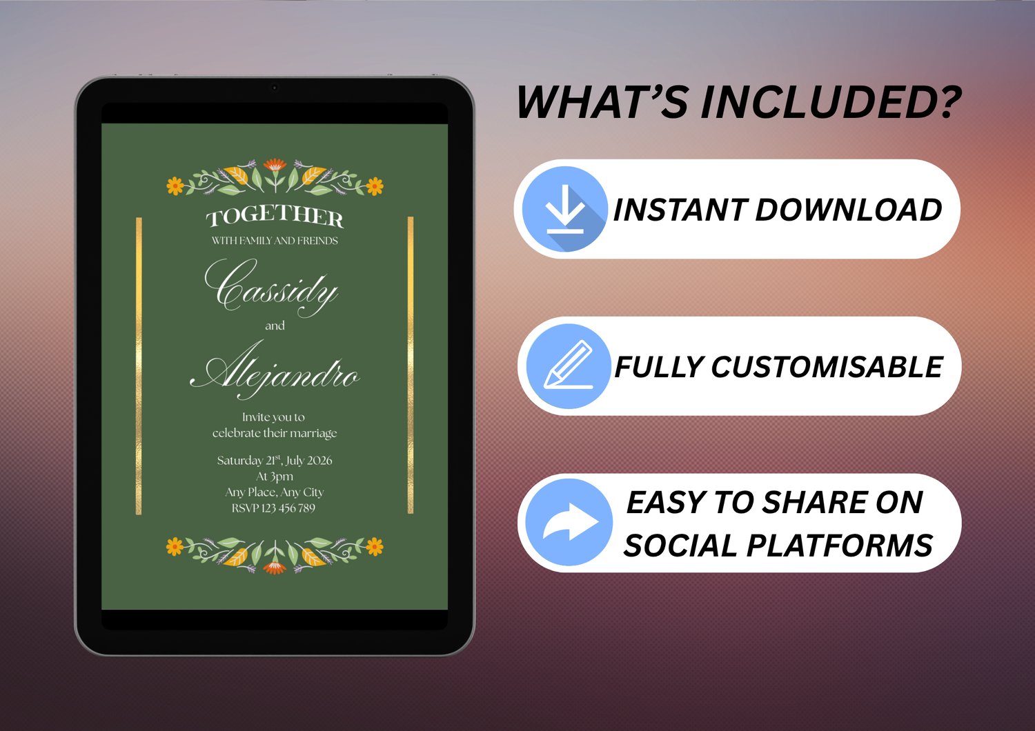 Green Floral Digital Invitation – 100% Customisable on Canva for Free!