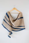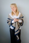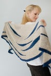 The shawl begins at the center and is worked outwards to border. It is worked primarily in alternating 2-row stripes of Garter stitch. Five inserts of a third color are shaped with short rows and give the shawl a slightly asymmetrical shape. The border is also worked in the third contrasting color.