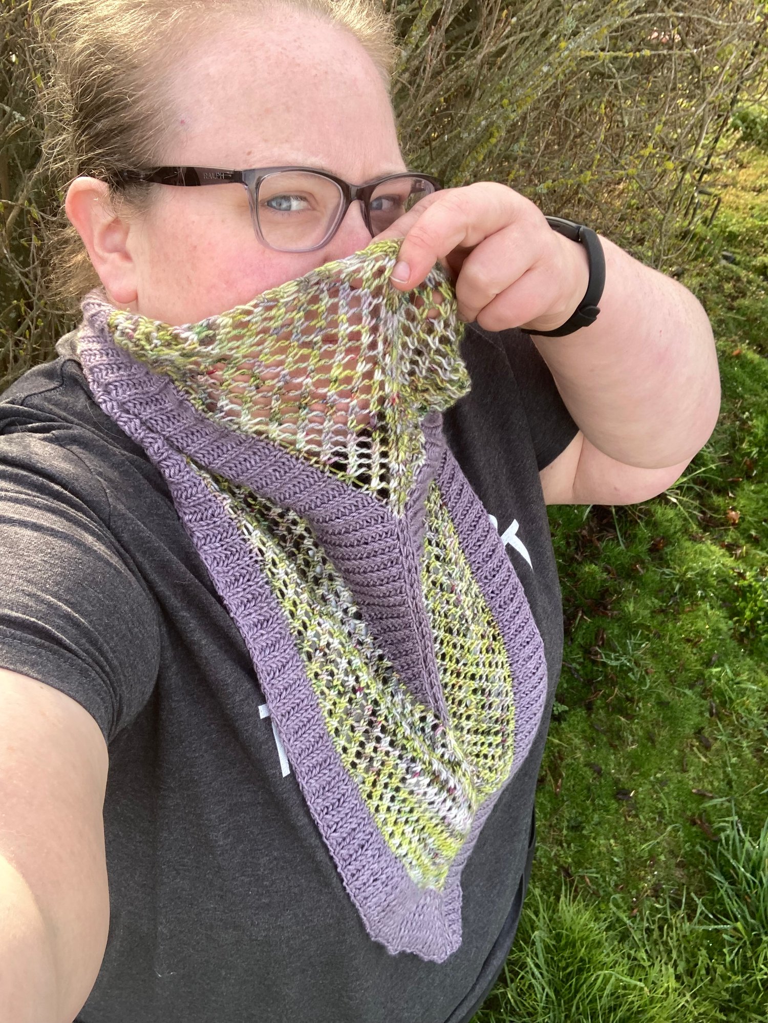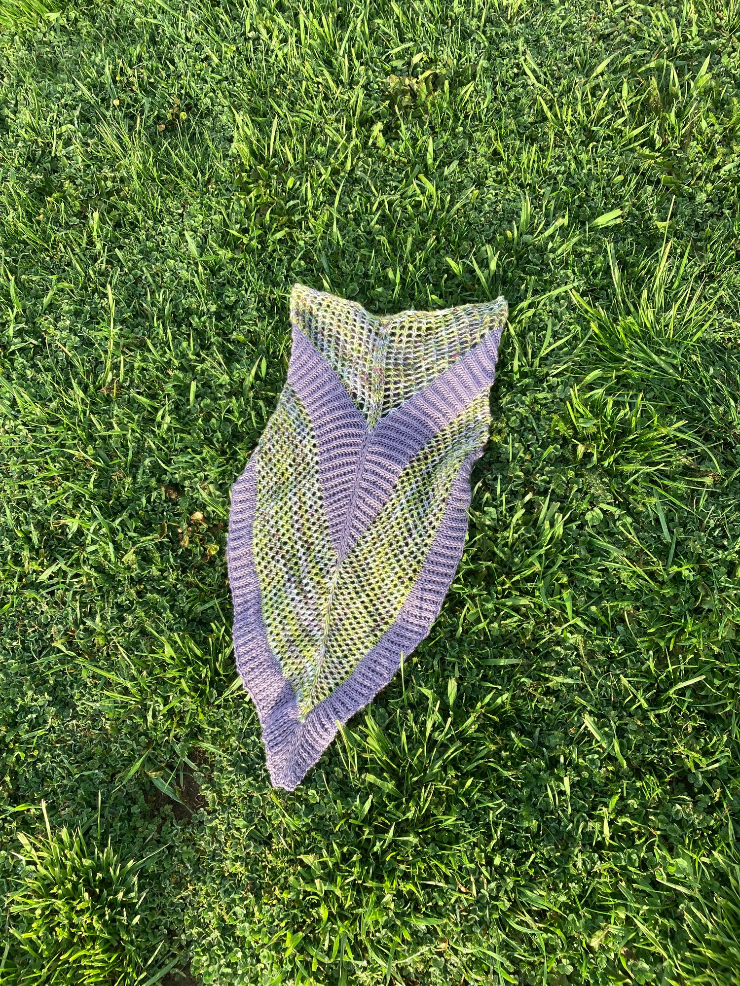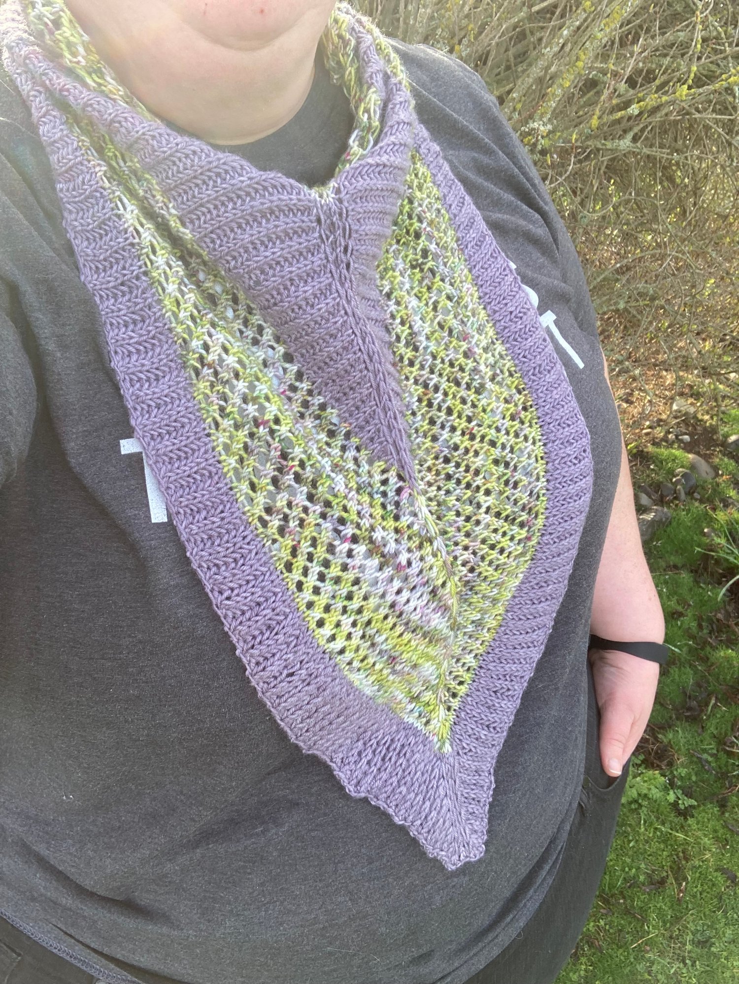 Yarn: Yarnaceous Fibers’ Salta Fingering 4Ply 437 yards per 100-gram skein; Castle Hayne colorway (MC). Yarnaceous Fibers’ Salta Fingering 4Ply 437 yards per 100-gram skein; Purponite colorway (CC). I used 50 grams of MC and 50 grams of CC to knit this cowl.