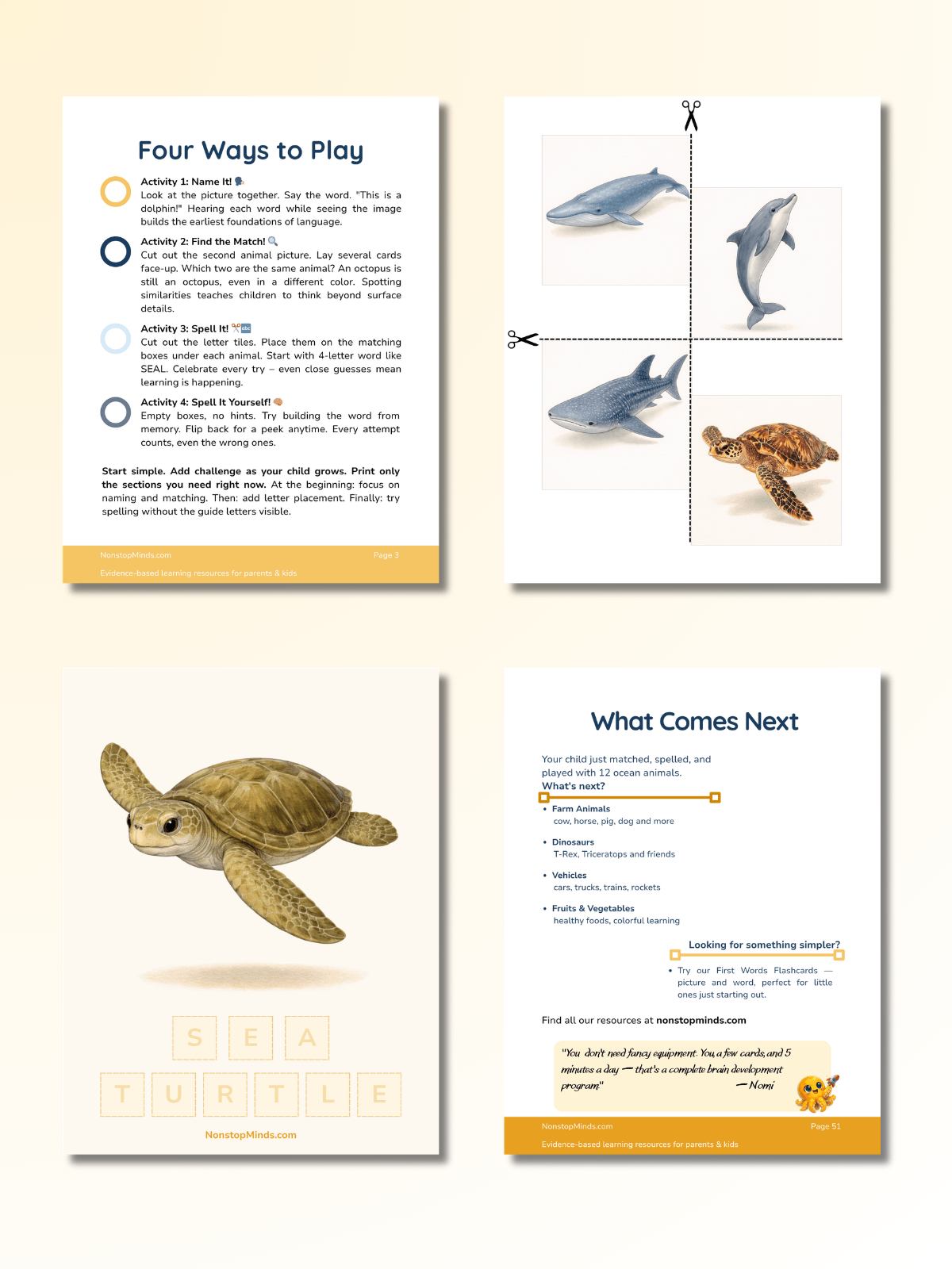 12 ocean animals. 4 activities. One set that grows with your child from first words to first spelling.