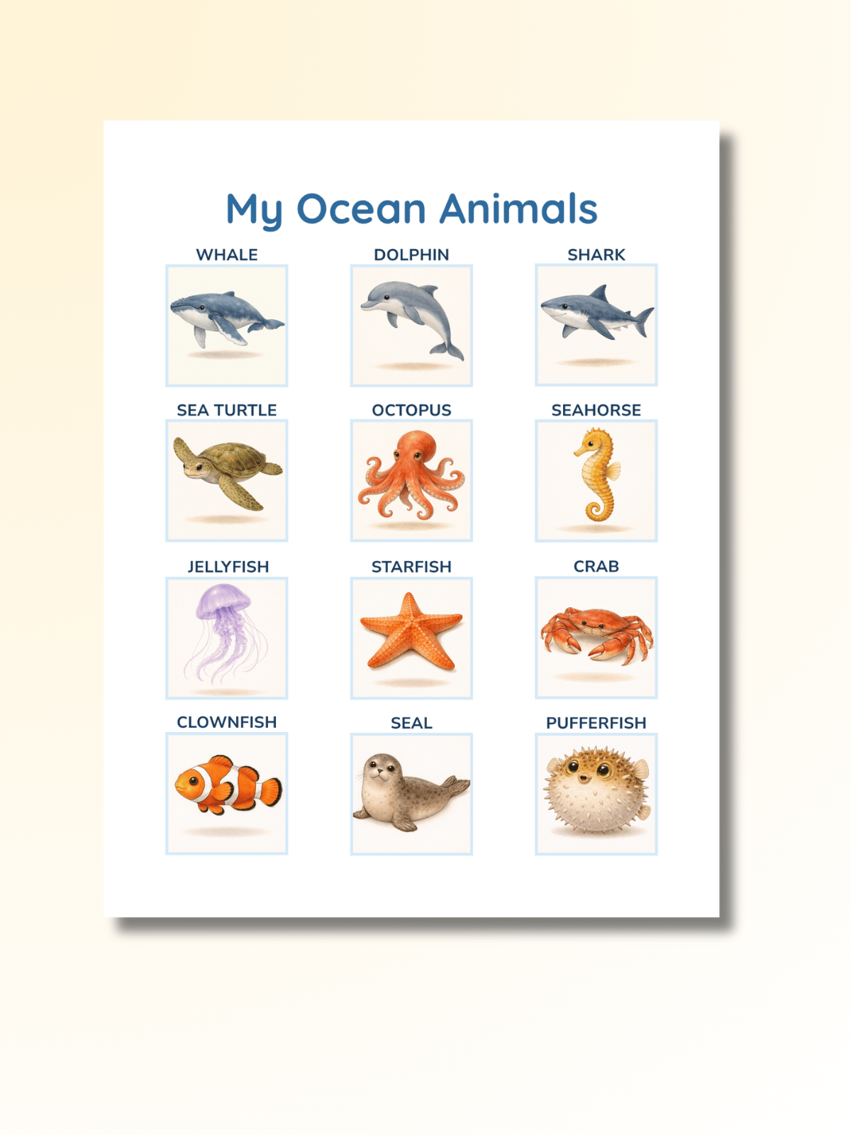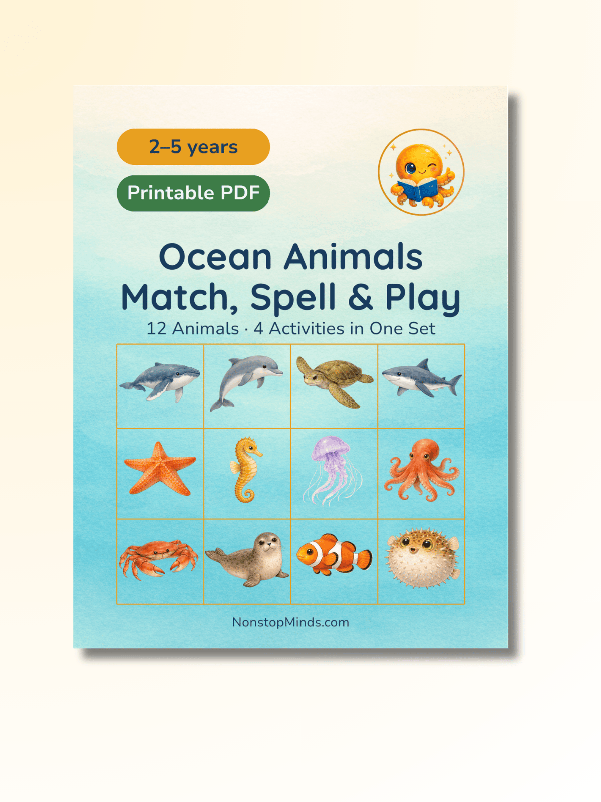 Ocean Animals Match, Spell & Play — 12 Printable Flashcards with Matching & Spelling Activities | Whale, Dolphin, Shark, Octopus + More | 2–5 Years | Instant Download