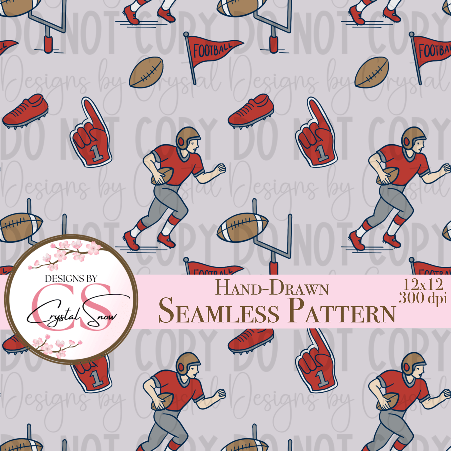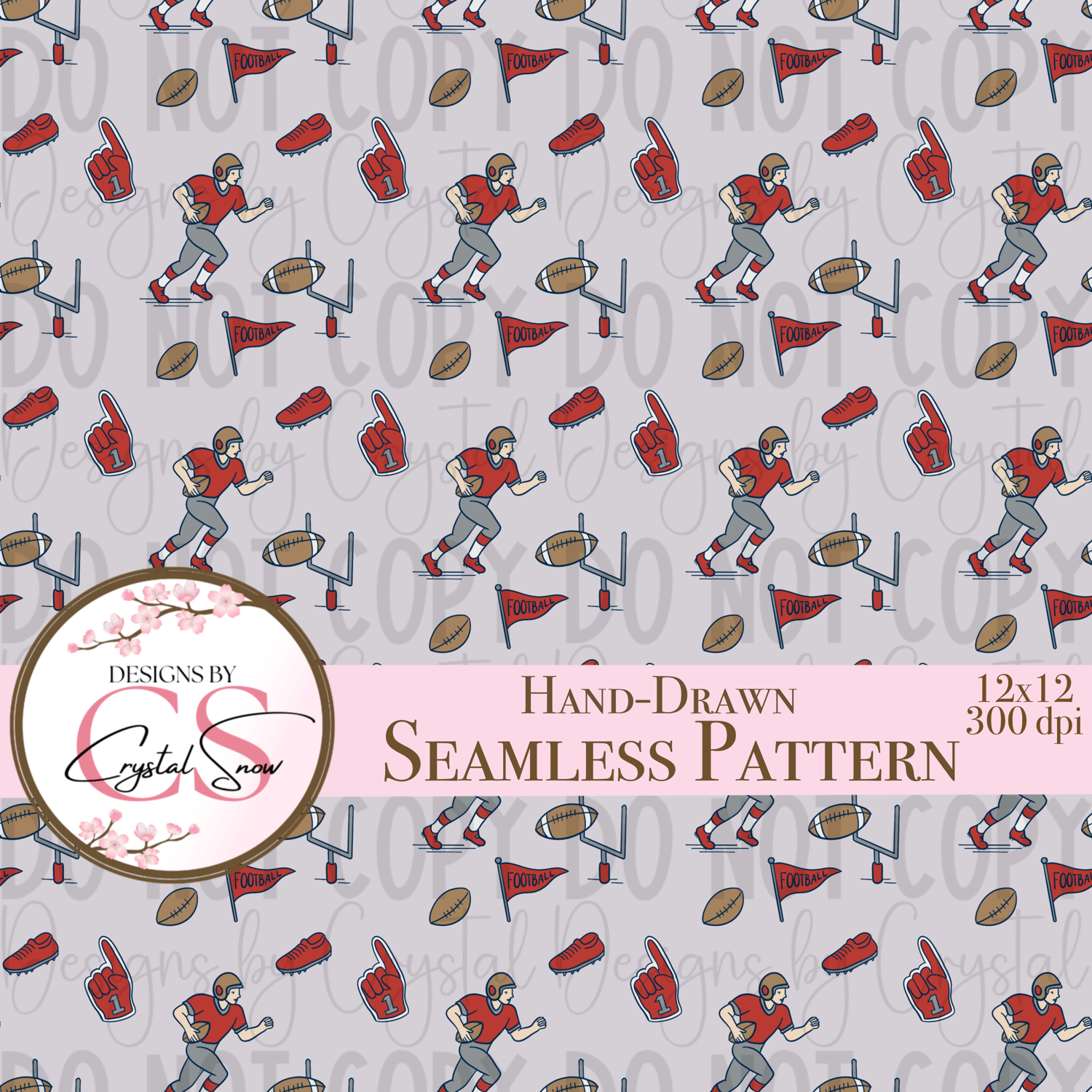 This seamless digital pattern features hand-drawn football players, goalposts, foam fingers, flags, shoes, and footballs in a classic red and grey color palette. The design creates a bold, sporty vibe that’s perfect for school spirit wear, custom fabric, scrapbooking, sublimation designs, and more.