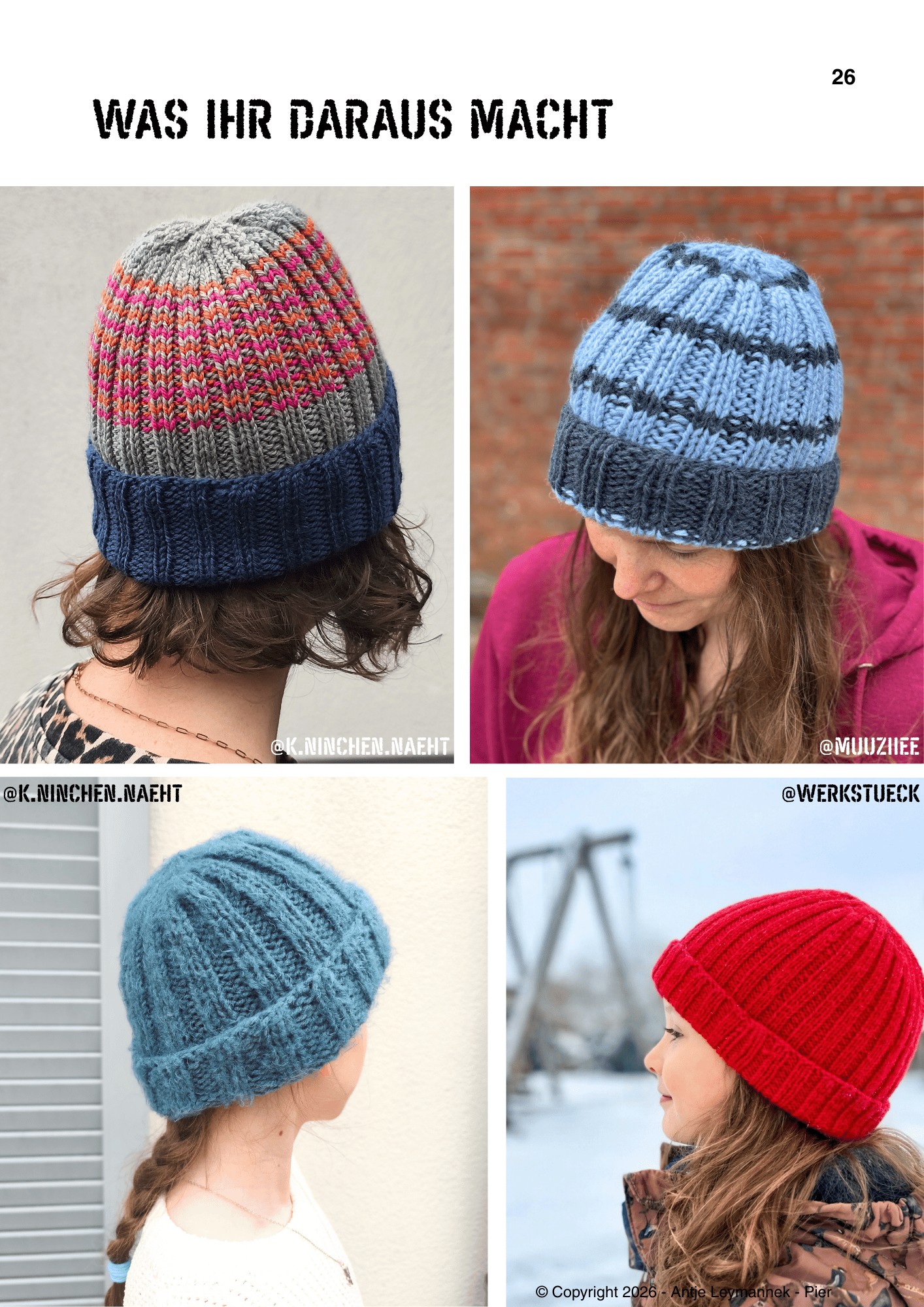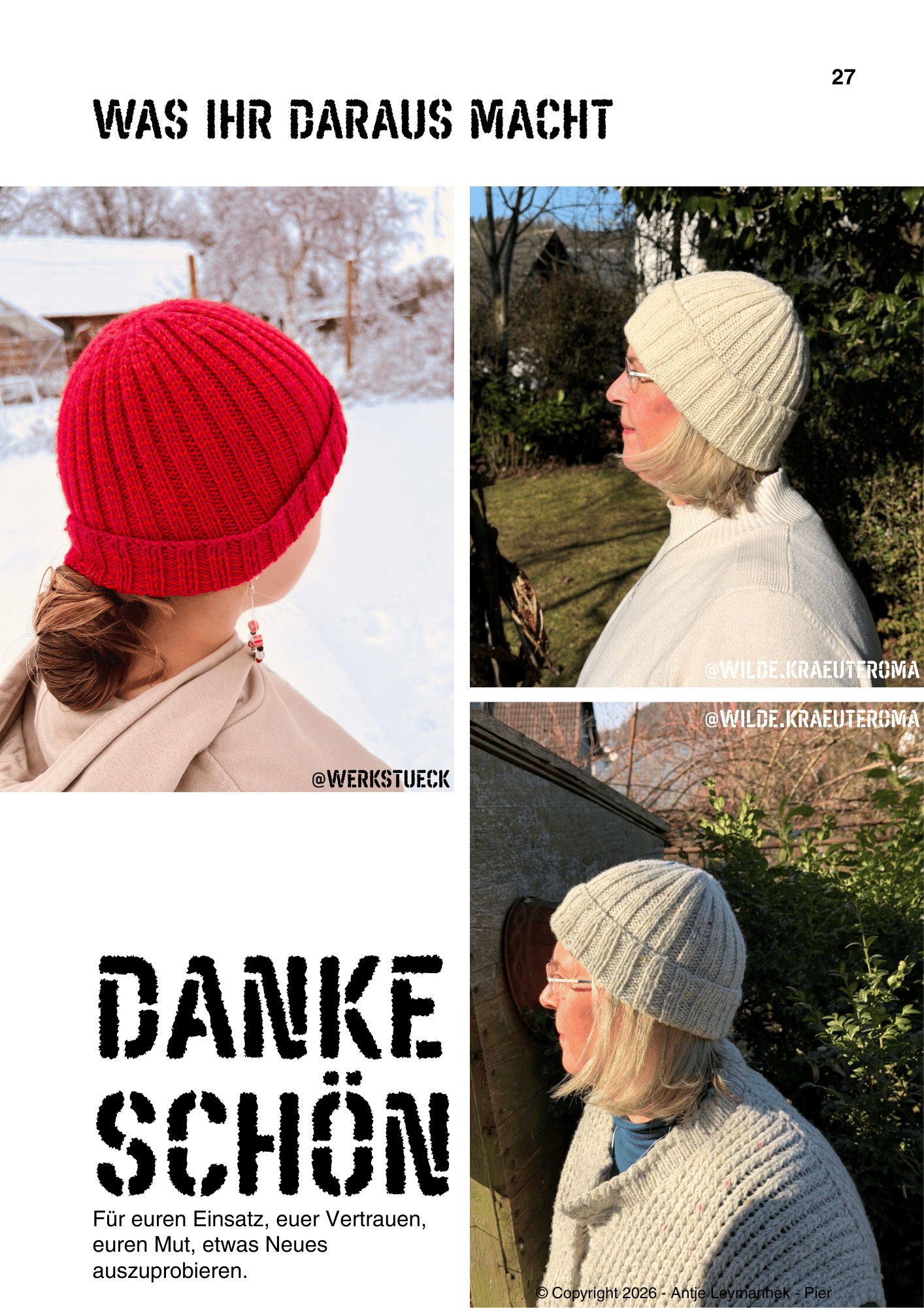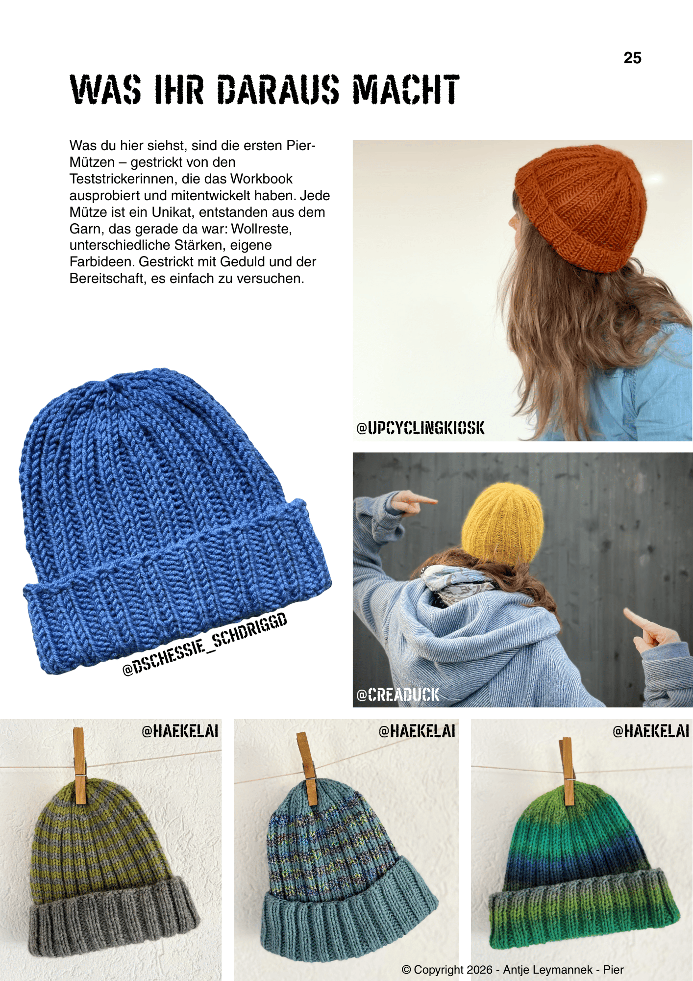 Pier ist keine gewöhnliche Mützenanleitung. Es ist ein 28-seitiges Workbook, das dich Schritt für Schritt durch den gesamten Entstehungsprozess begleitet – von der Garnauswahl über die Berechnung deiner individuellen Maschenzahl bis hin zur fertigen Mütze.