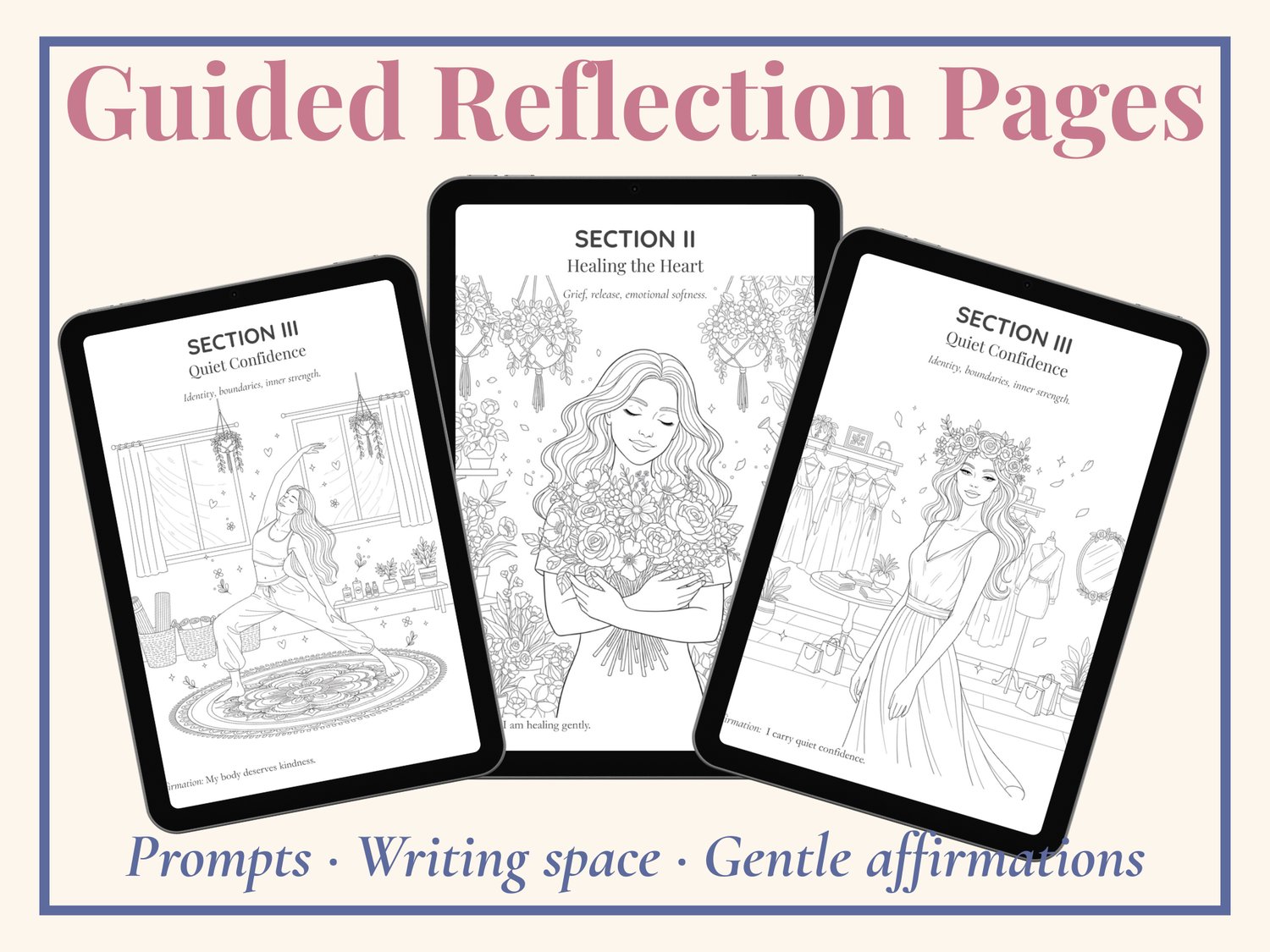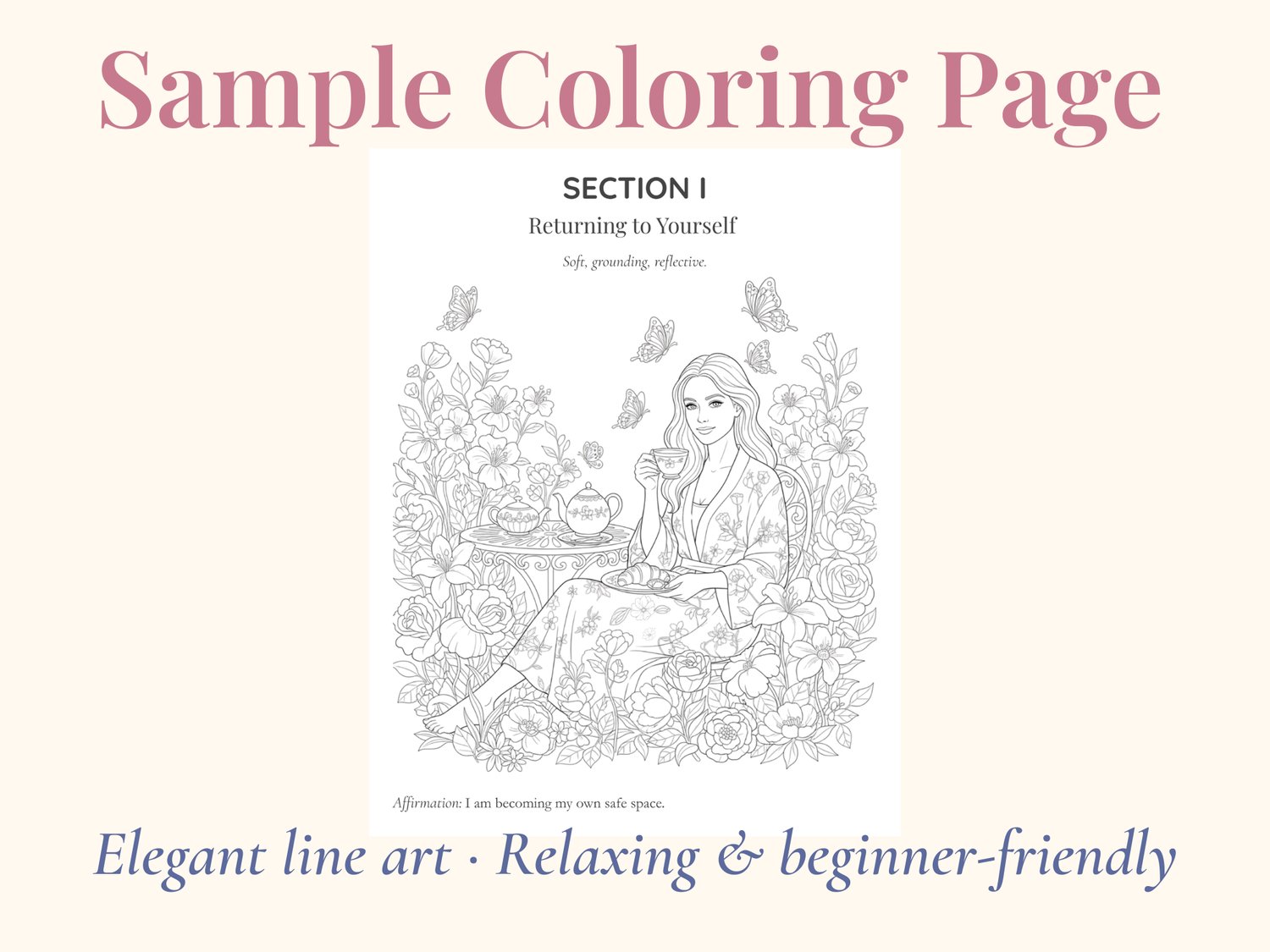 This 115-page self-love coloring and reflection book blends elegant line-art illustrations with gentle journal prompts, affirmations, and reflective pauses—inviting you into a slower, more compassionate rhythm.