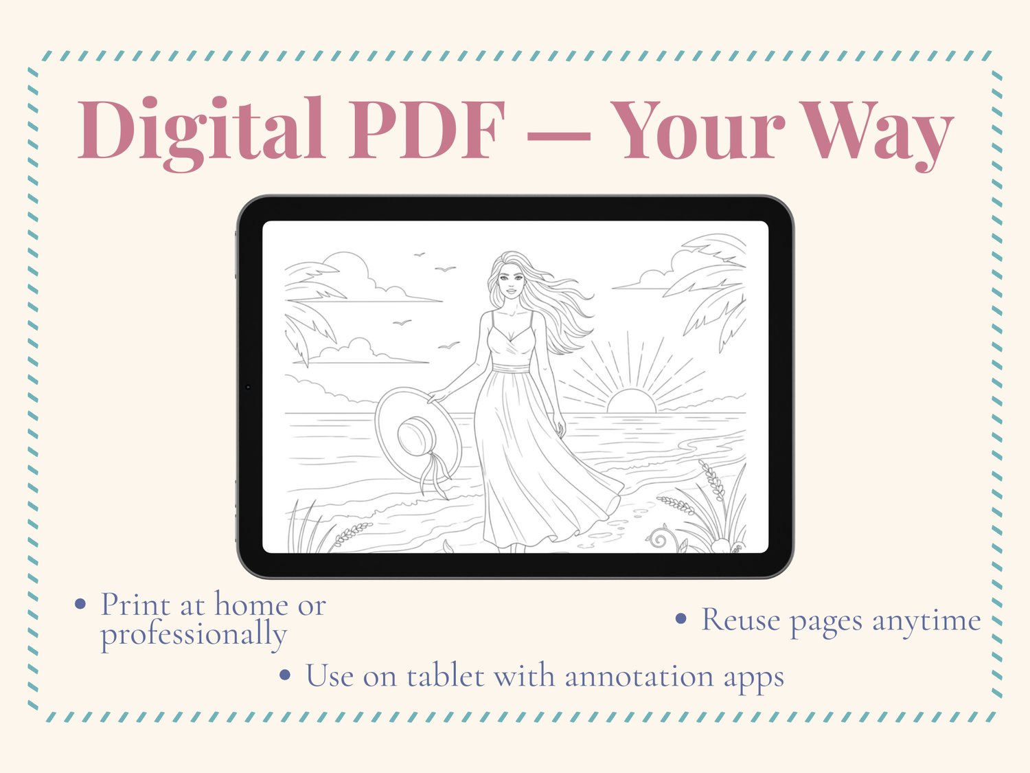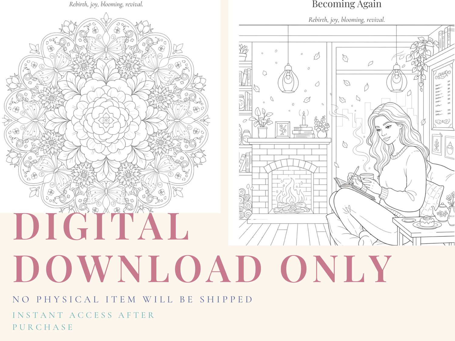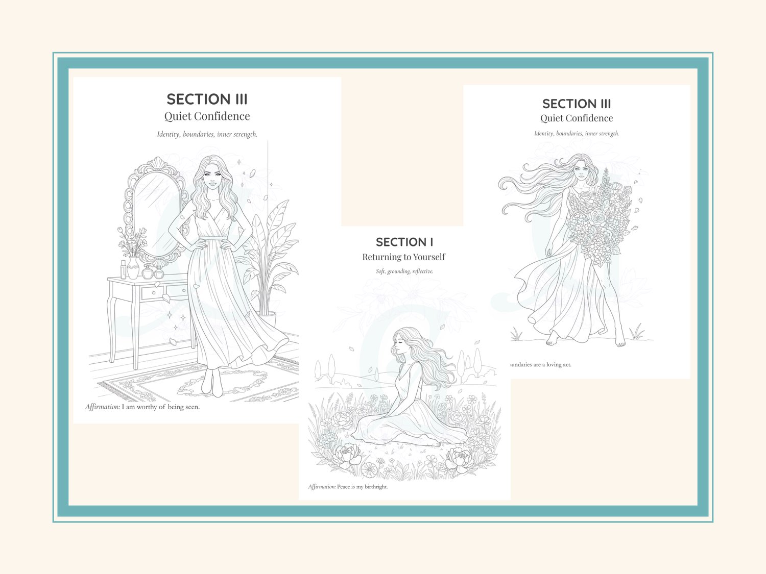 • Calming coloring pages featuring women, florals, nature, and gentle empowerment