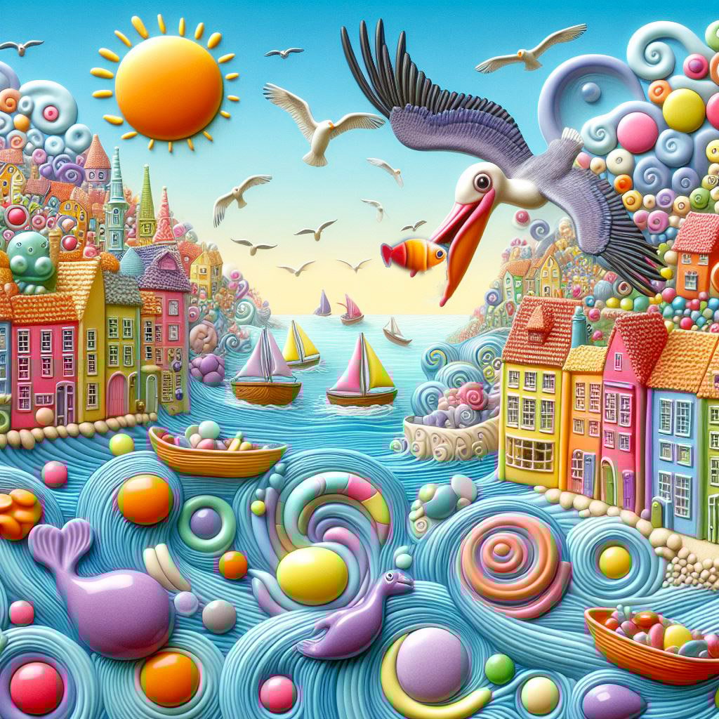 A whimsical world. A seaside village of quirky houses made of mosaics, looking across at blue sea where whimsical boats ride on curly waves, Fish leap high out of the water, and a pelican scoops a fish into its mouth.