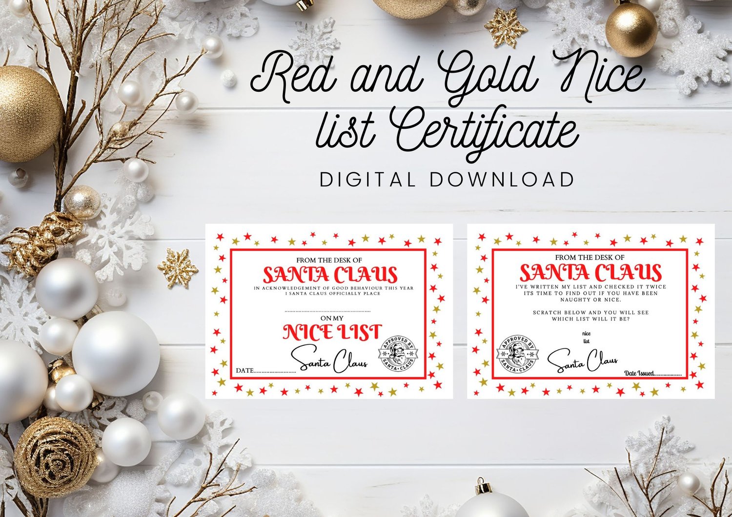 Christmas Nice list certificate and scratch off. Print direct on A4 and add a scratch panel which can be purchased off Amazon. Digital download only, no physical item will be sent. Not for digital resale.