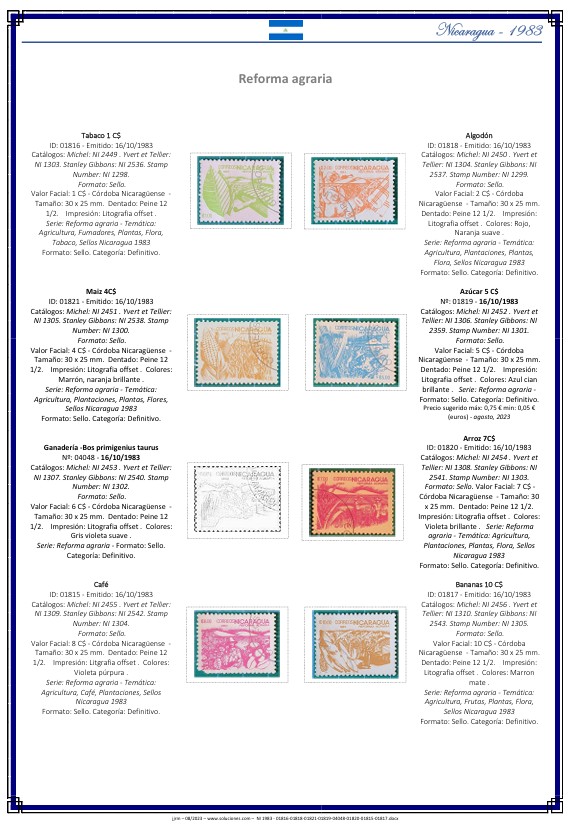 Nicaragua 1983 – Reforma agraria (Catálogo Sooluciones NI-1983-01816-01818-01821-01819-04048-01820-01815-01817) – Ficha PDF imprimible