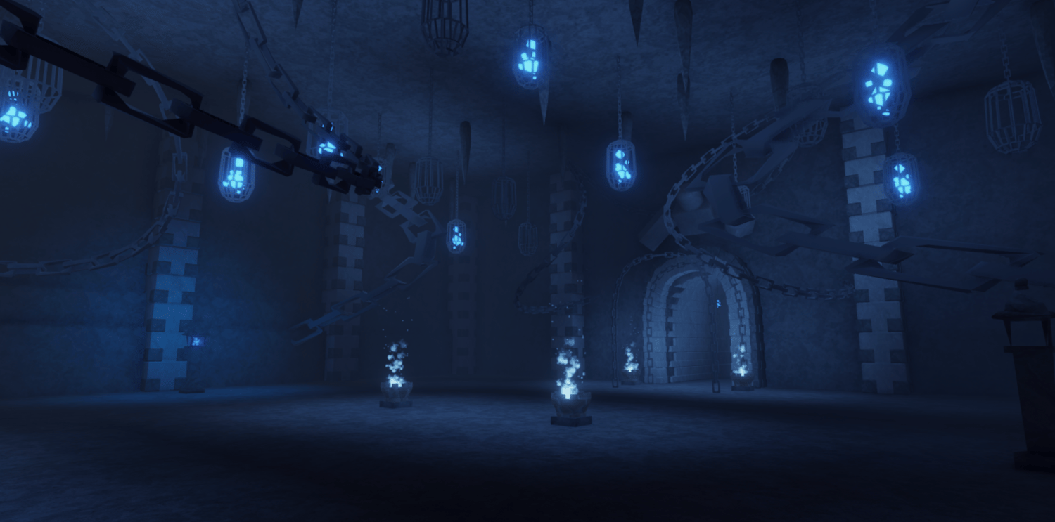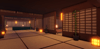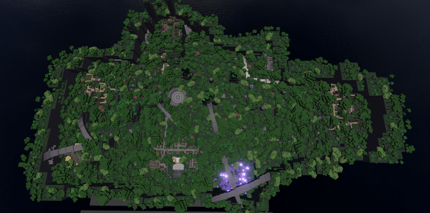 A vast Japanese-inspired forest featuring dense stylized trees, traditional lantern-lit villages, and mysterious glowing crystal caves. Warm wooden buildings with shoji screen interiors contrast against misty forest paths and dark dungeon ruins illuminated by blue ethereal lights. The terrain spans sprawling woodlands, foggy graveyards, and hidden underground chambers. Atmospheric lighting shifts from cozy village warmth to eerie mystical glows throughout the map. The layout supports expansive exploration across multiple biomes and landmarks. Perfect for anime RPGs, Demon Slayer-style games, samurai adventures, or open-world experiences.