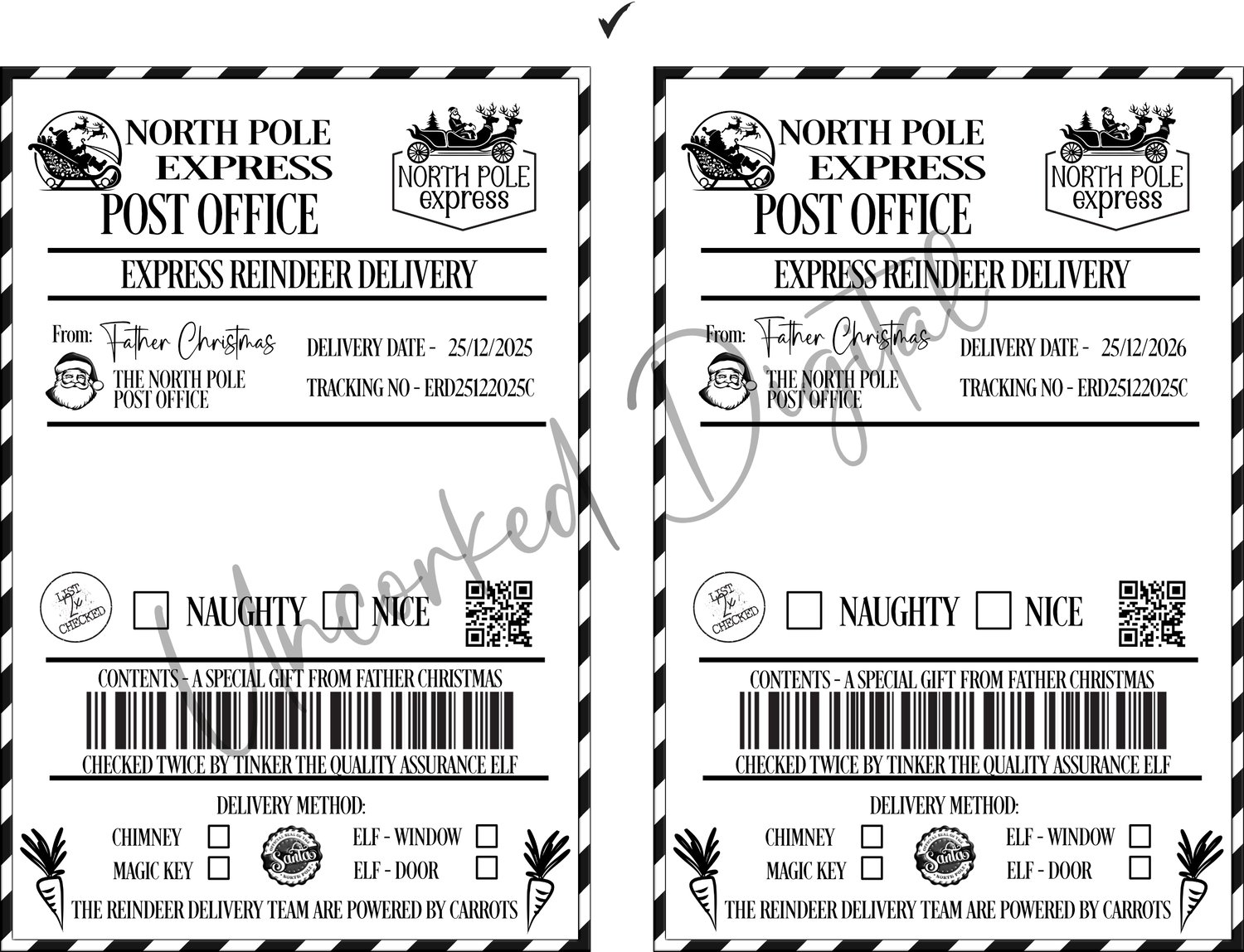 Black and White Santa's postage label, express reindeer delivery with years 2025 and 2026 included, with a separate tick for you to place in the appropriate delivery method box.