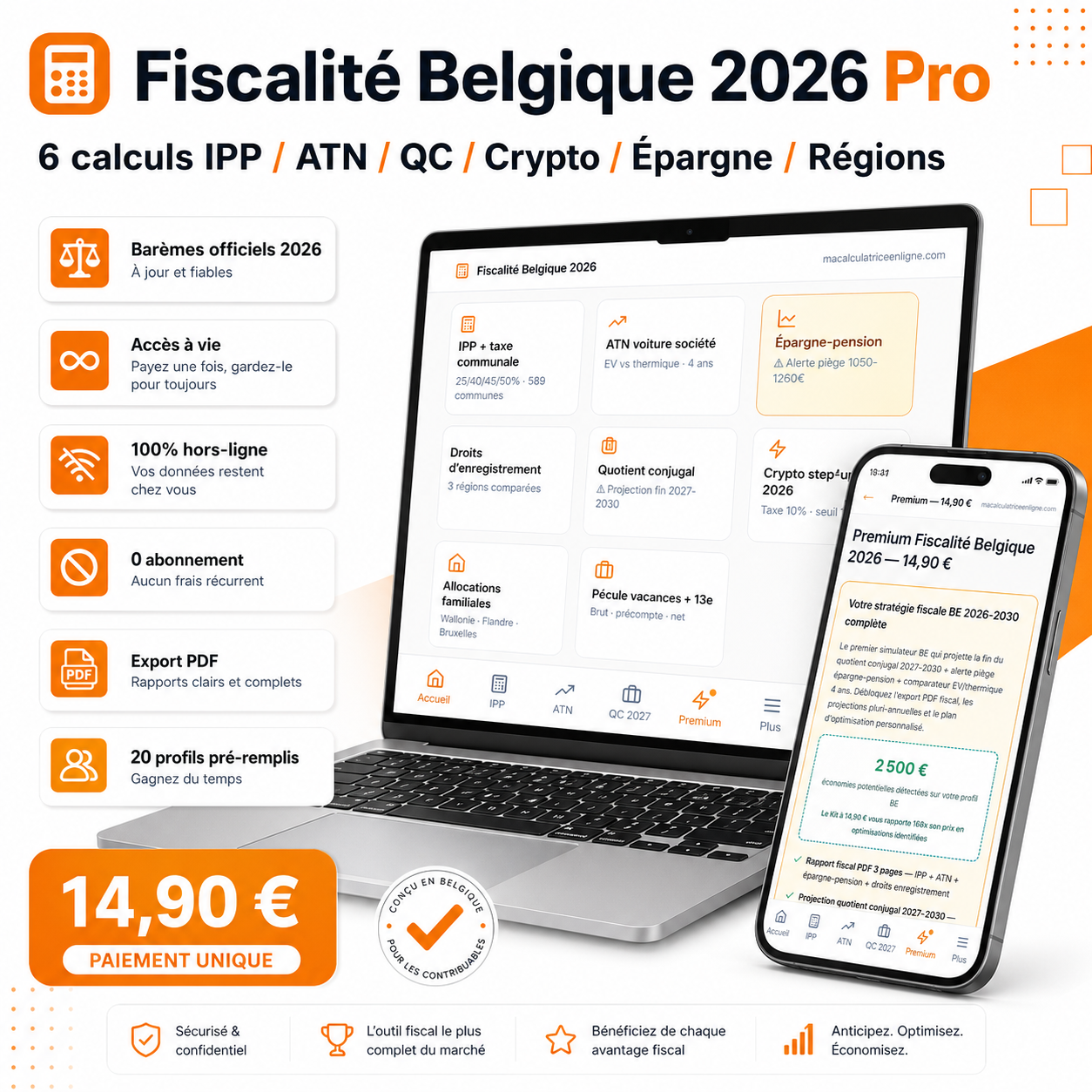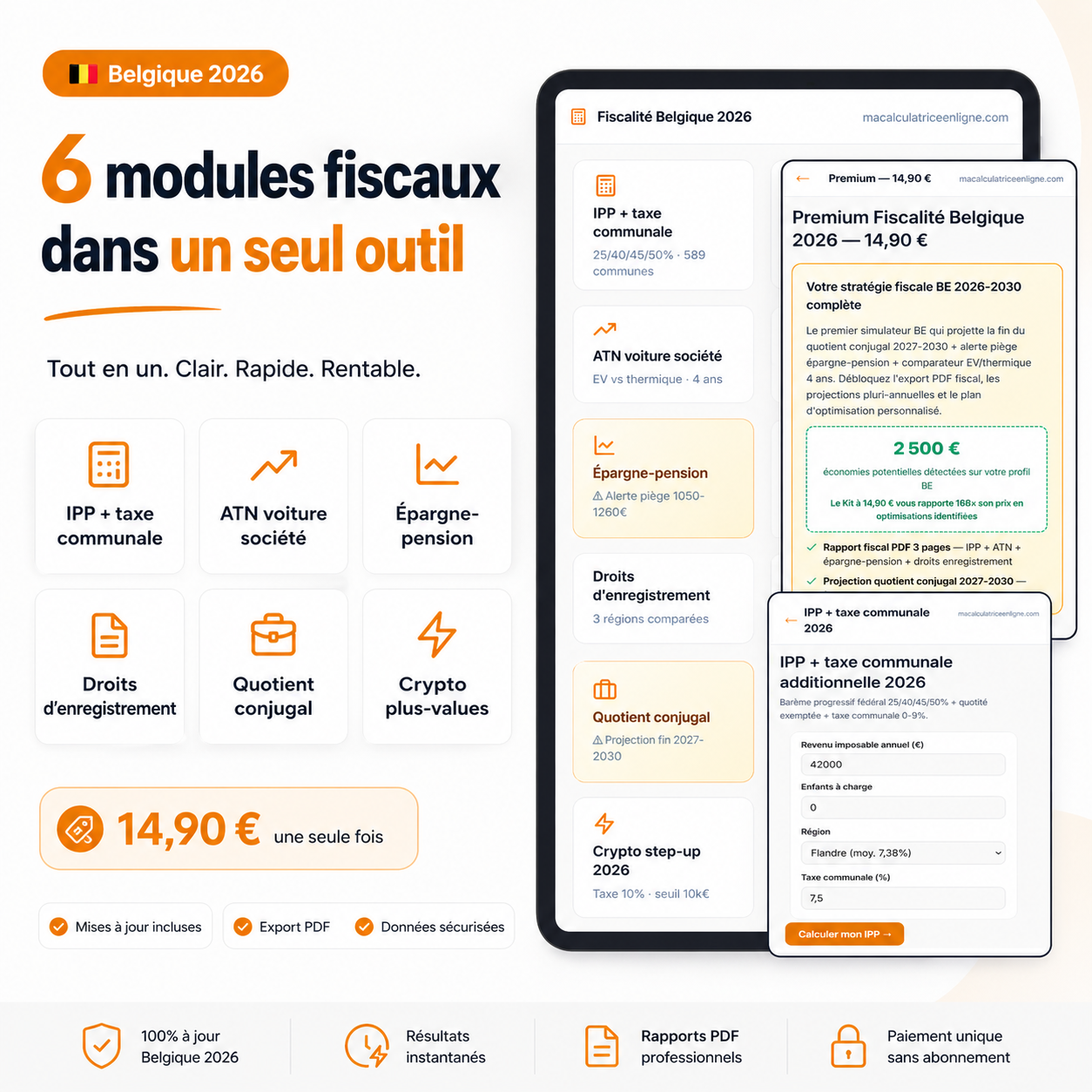 Il inclut 6 modules : IPP + taxe communale, ATN voiture société, épargne-pension, droits d’enregistrement, quotient conjugal 2027-2030 et crypto plus-values 2026.