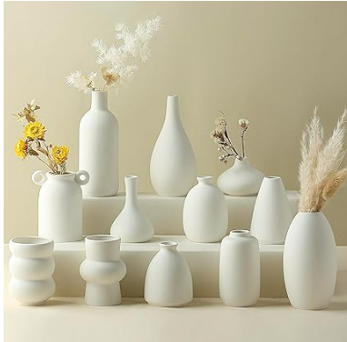 12 small ceramic vases, each with various shapes, sizes, and patterns. These charming bud vases feature matte unglazed surfaces with an organic, rustic look. Great for farmhouse and boho or modern weddings, living room, and home decor. Each of these unique small rustic vases comes with a different design and shape, best suited for pampas grass or a single stem of the flower. They are also charming enough to be appreciated on their own. Use these mini bud vases to bring out the bright colors of fresh cut or dry flowers, pampas grass, or artificial flowers. You can use them as a reed diffuser too.