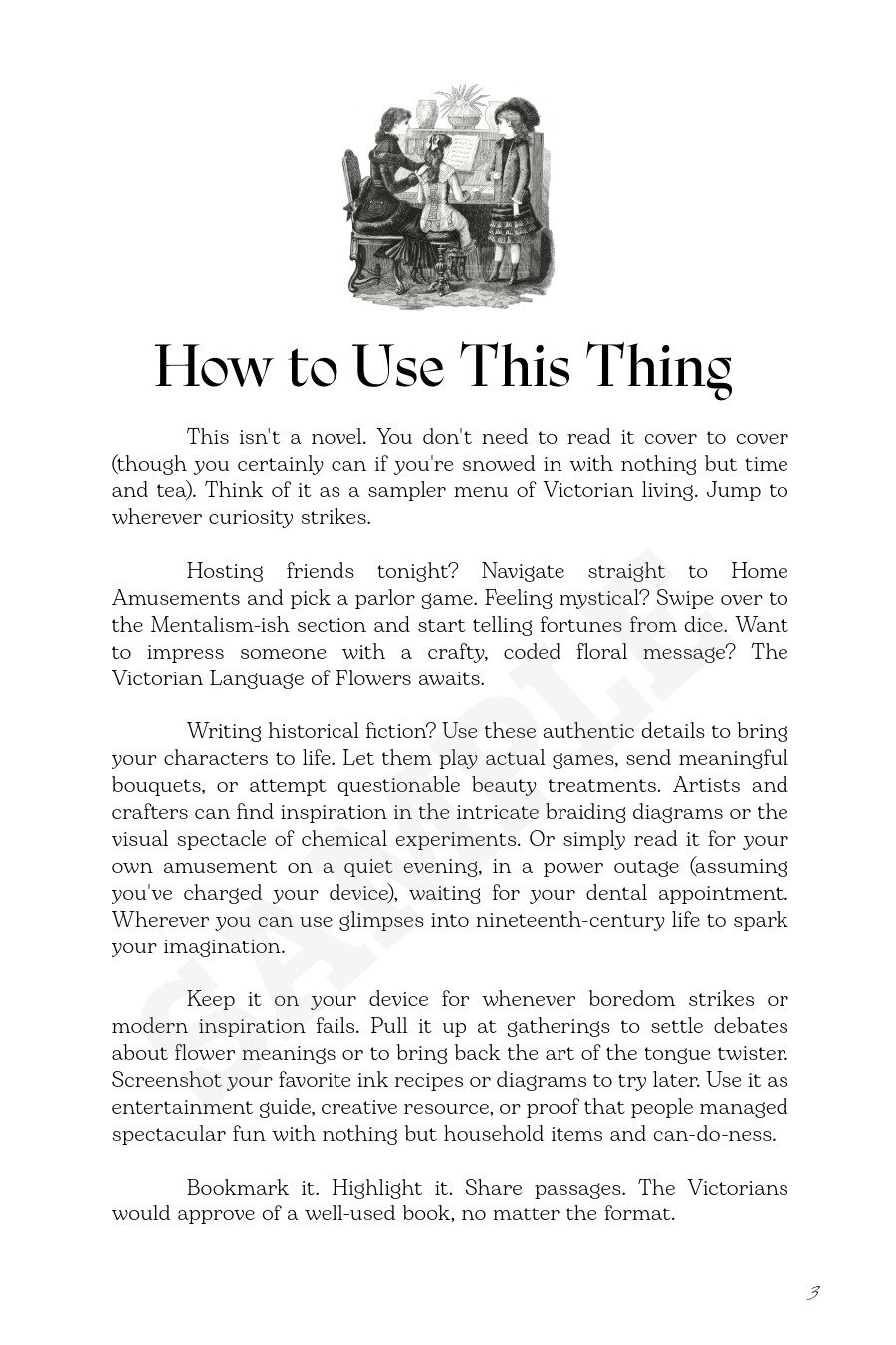 This ebook includes only stuff that is relevant and do-able today. Yes, we did find some parlor games that would put you at risk of arrest or ditched by your insurance company. That is why the victorian lifestyle was so great. Proper and dangerous all at the same time. Life goals.