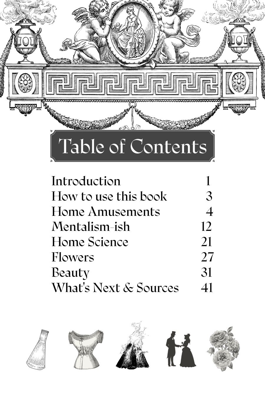 Thanks to technology and electricity, you can live this life without the risk of mercury poisoning or candle soot in your sinuses. Inside this victorian themed PDF (imagine telling Queen V about PDFs) you will learn about the coolest parlor games, word plays, mentalism, fortune telling, chemical tricks, beauty recipes (also kind of chemical tricks), and secret language of flowers.