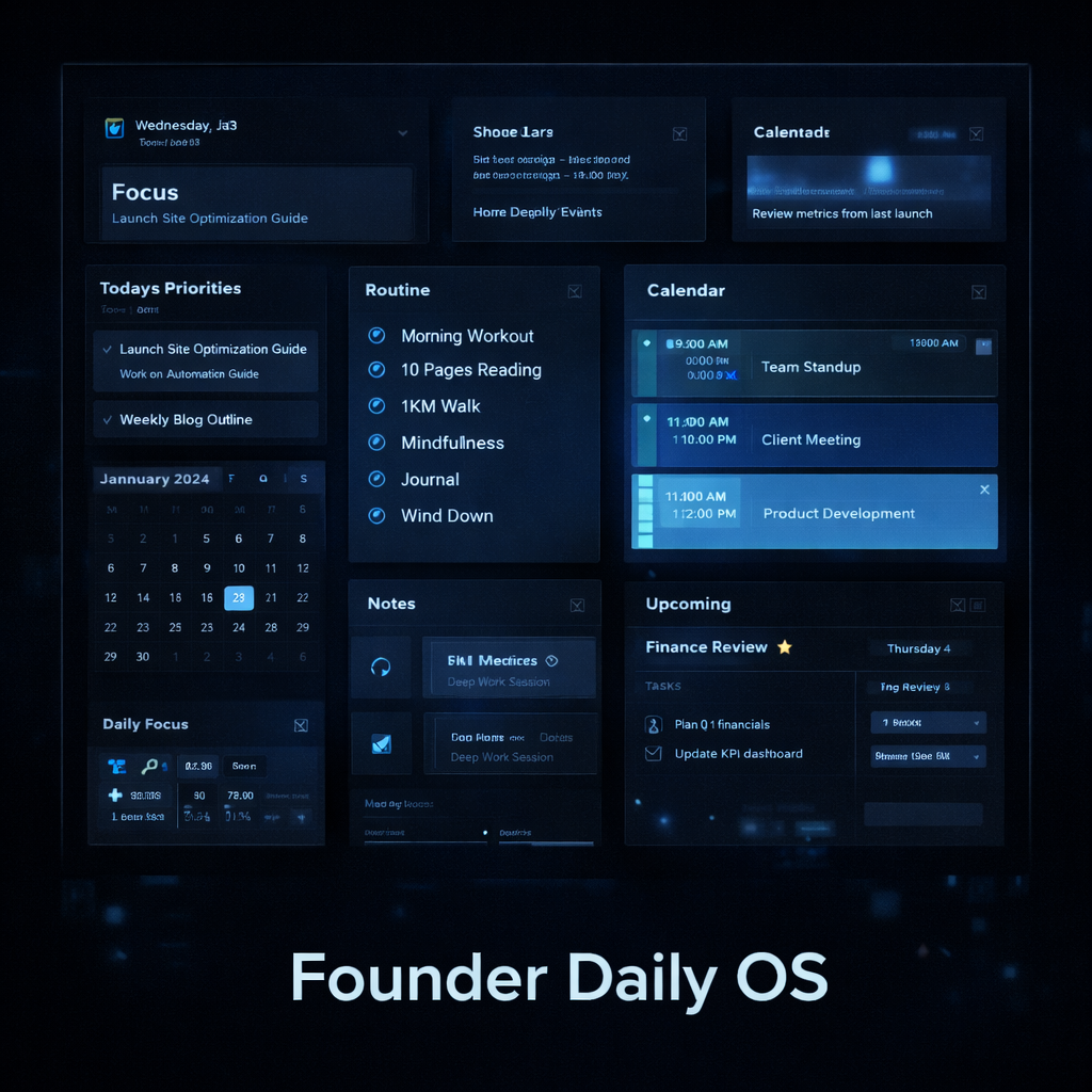 Founder days don’t fail from lack of effort—they fail from lack of structure. This playbook gives you a daily operating routine: choose priorities, protect focus blocks, contain reactive work, capture decisions, and reset cleanly.
