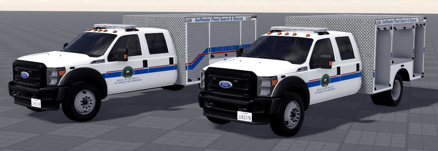Based off of the LAFD CalOES Swiftwater Search & Rescue Unit. The livery and ELS is 99% accurate to real life. This includes 3 stages of ELS and 3 stages of directionals. The vehicle also comes with A-chassis so it isn't static. The vehicle doesn't come with any sirens so you will have to add your own. Each vehicle comes with two variants, one has opening compartments while the other doesn't. These include electronics which consist of headlights, blinkers, brakes, and much more!
