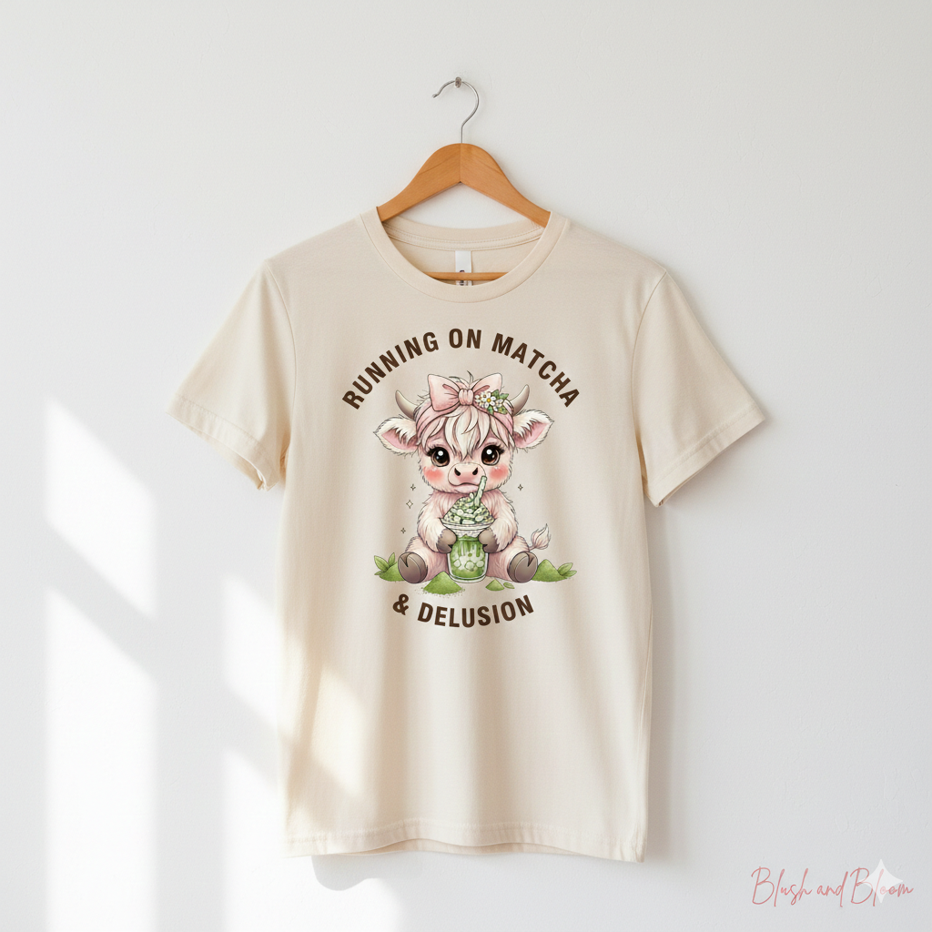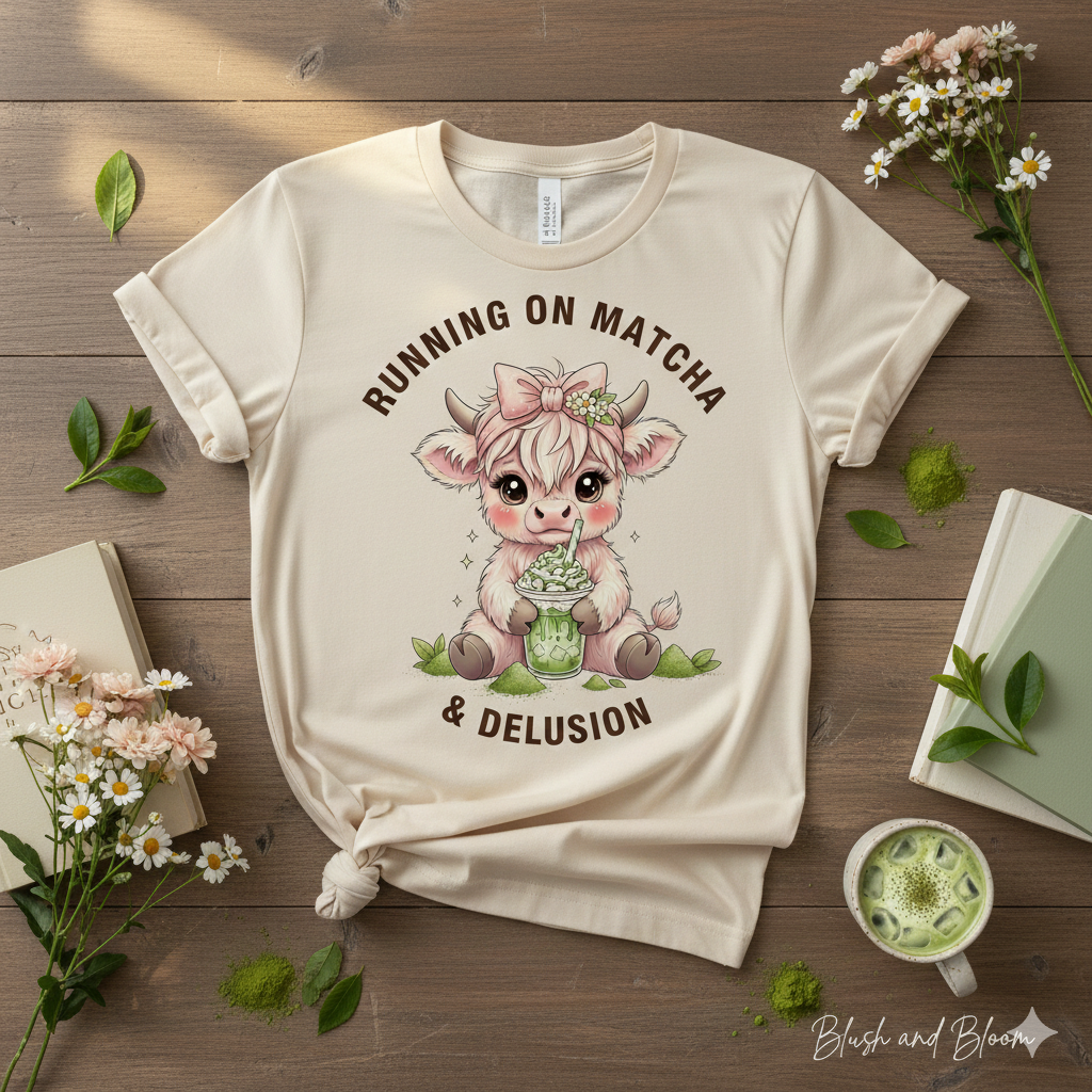 Featuring an adorable fluffy pink Highland cow wearing a pink bow with flowers, holding an iced matcha latte with whipped cream. The funny quote "Running on Matcha & Delusion" curves around the design in bold lettering. Perfect for matcha lovers, coffee enthusiasts, and anyone who appreciates cute animal designs with relatable humor!