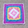 Sample squares shown in Stylecraft Special DK in White (Color A), Magenta (Color B), Fondant (Color C), Citron (Color D), Turquoise (Color E) and Bluebell (Color F).