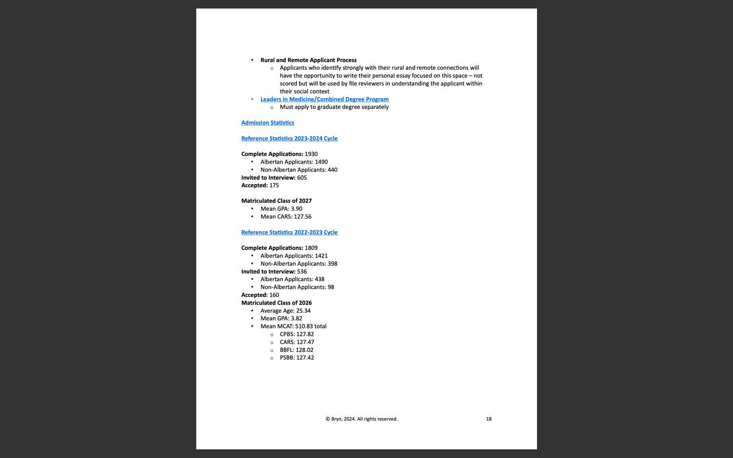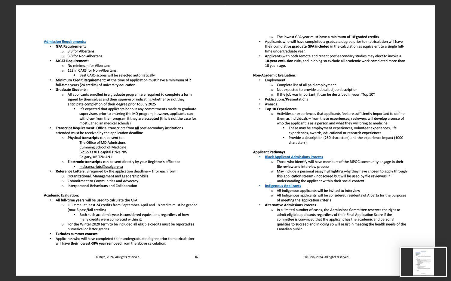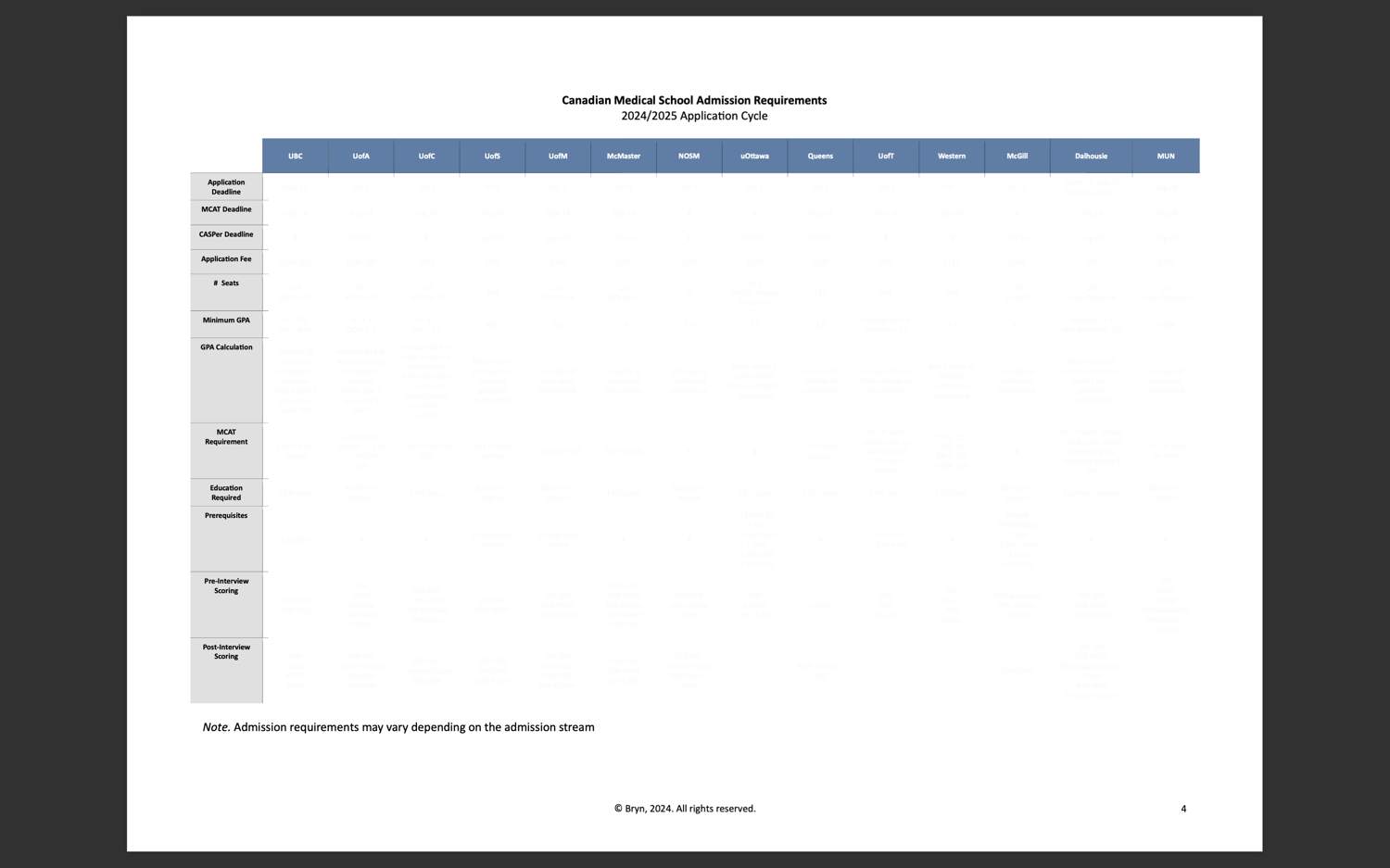 I created this comprehensive 54-page application handbook to cover essentially everything you need to know about applying to medical school in Canada. This guide includes a one-page overview of application deadlines and admission requirements for quick reference and then each school has its own section, ranging from 2 to 6 pages, detailing essential information such as: