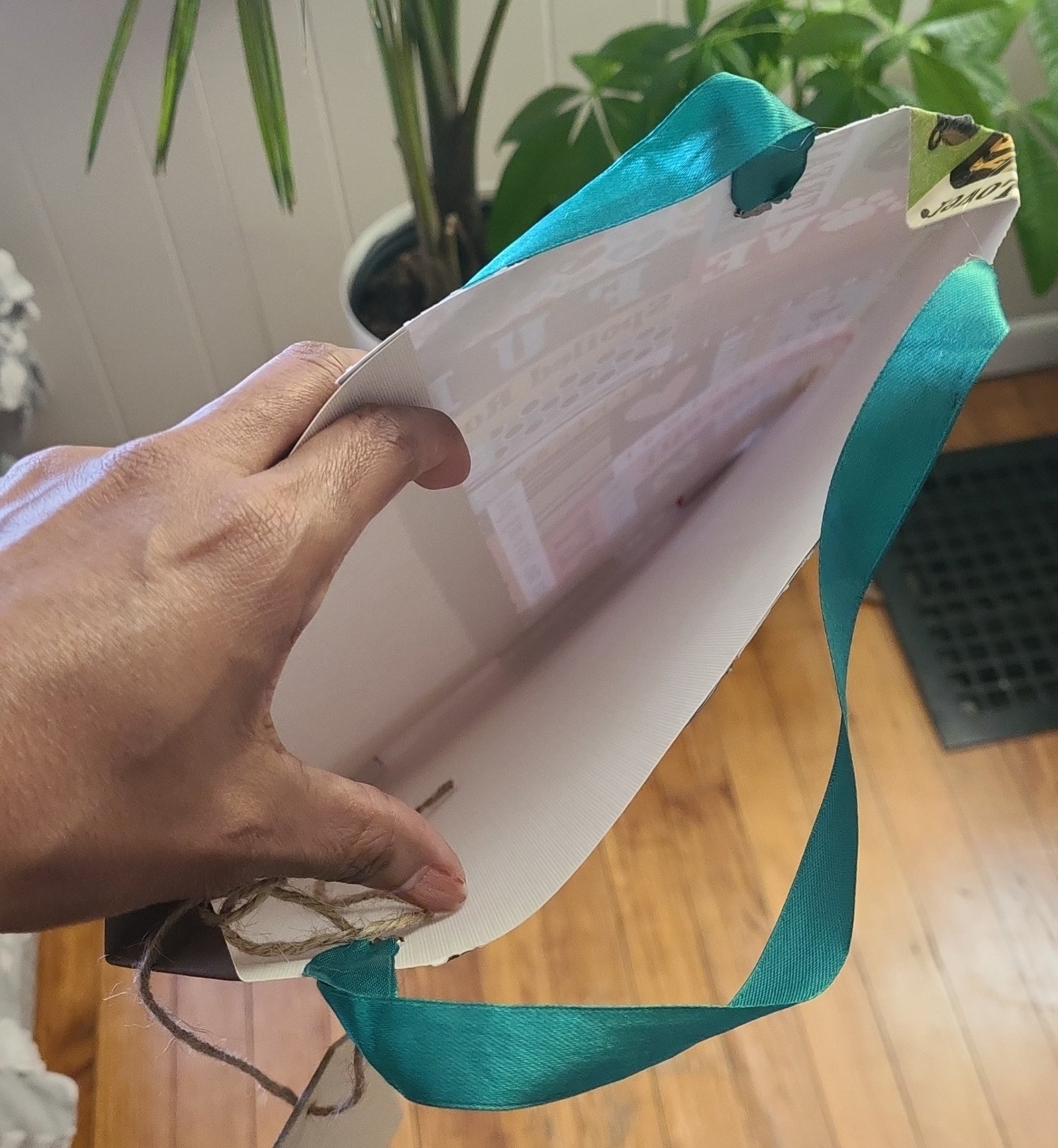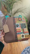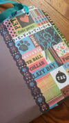 Keep your books, supplies, or gifts organized in style with this handmade small envelope-style tote. Crafted from a coordinated trio of high-quality scrapbooking cardstock, this tote features a warm brown palette with a playful pet dog-themed pattern and decorative scrapbook trim accents. The ribbon handle is securely adhered for added strength and comfortable handling, making this tote both charming and functional.