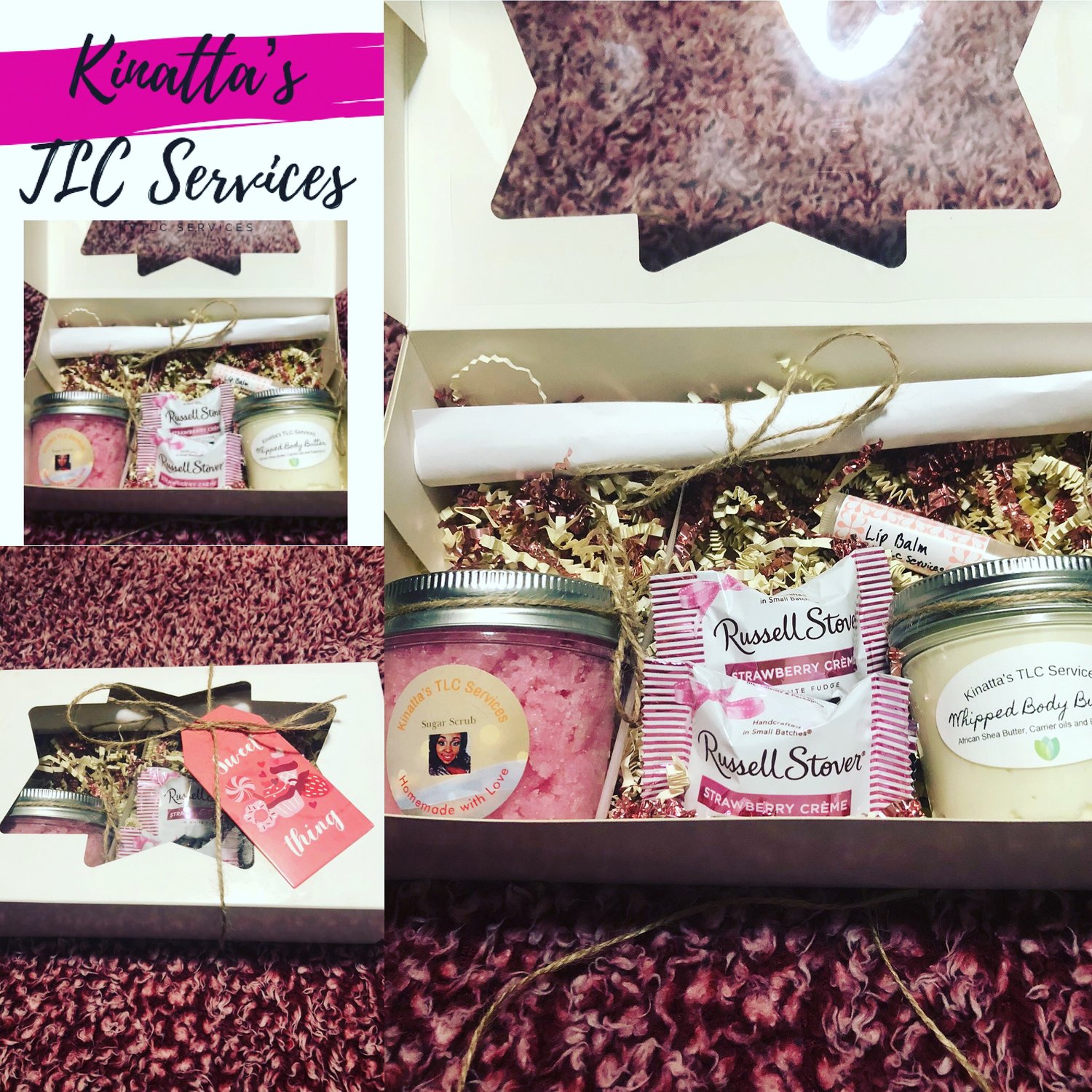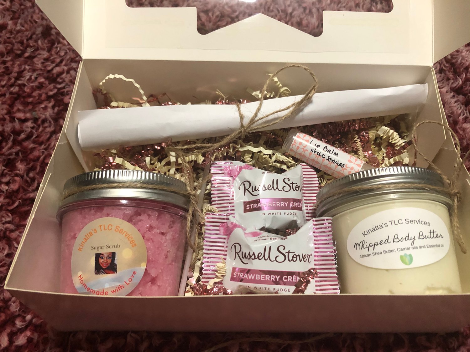Homemade with love and all natural ingredients! Includes: Sugar Scrub, Whipped Body Butter, Lip balm, Candy and a free membership to online exclusive group for singles!