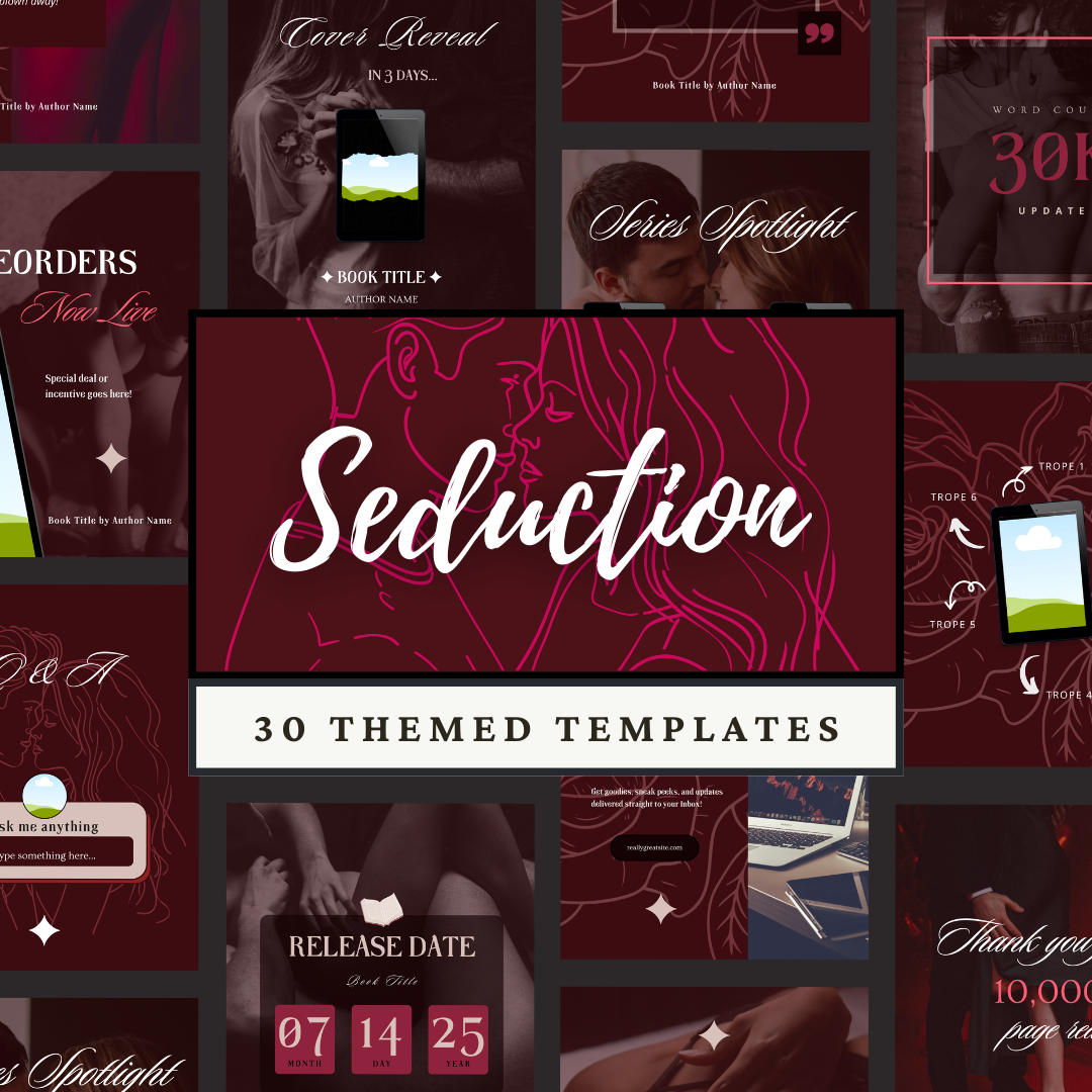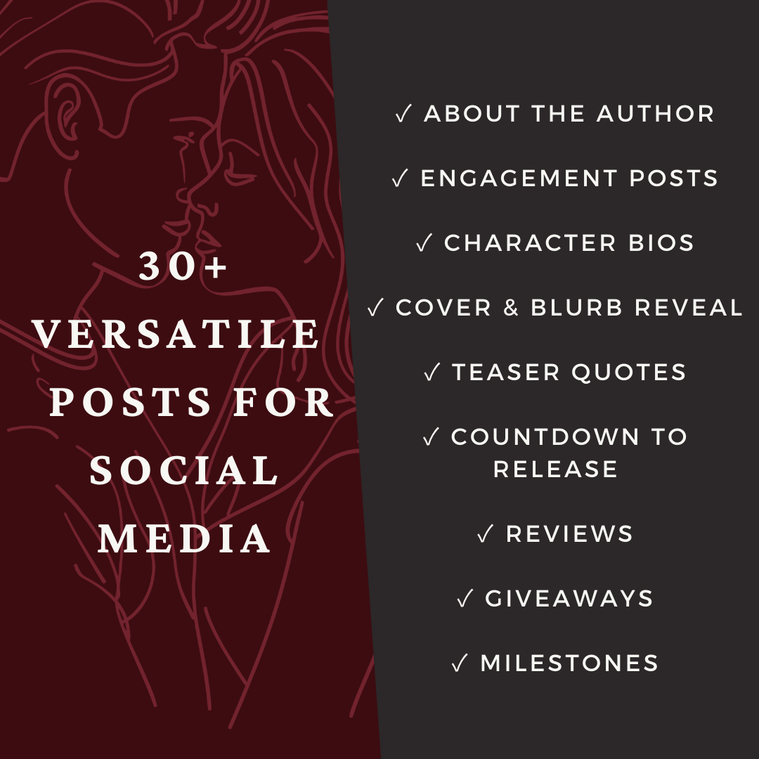 Simplify your social media marketing with this set of 30 customizable social media templates, perfect for Instagram, Facebook, and other platforms! Created specifically for indie authors, these templates include engaging prompts for your followers, promotions for your latest Romance novel, and even launch day countdowns.