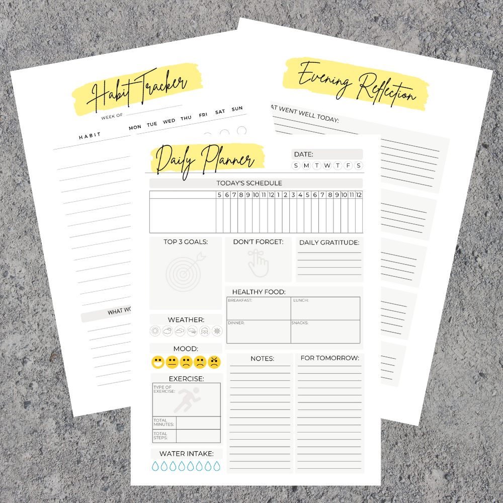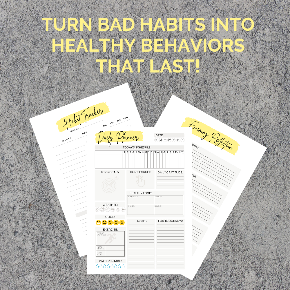 Are you ready to replace your bad habits with healthy behaviors that last? This quick $2 download will supply you with a daily planner, habit tracker, and evening reflection worksheet to help develop those behaviors that will improve your health and happiness! Download as many weeks as it takes to kick your bad habits to the curb and get on living your best life! Fits conveniently into your A5 daily planner.