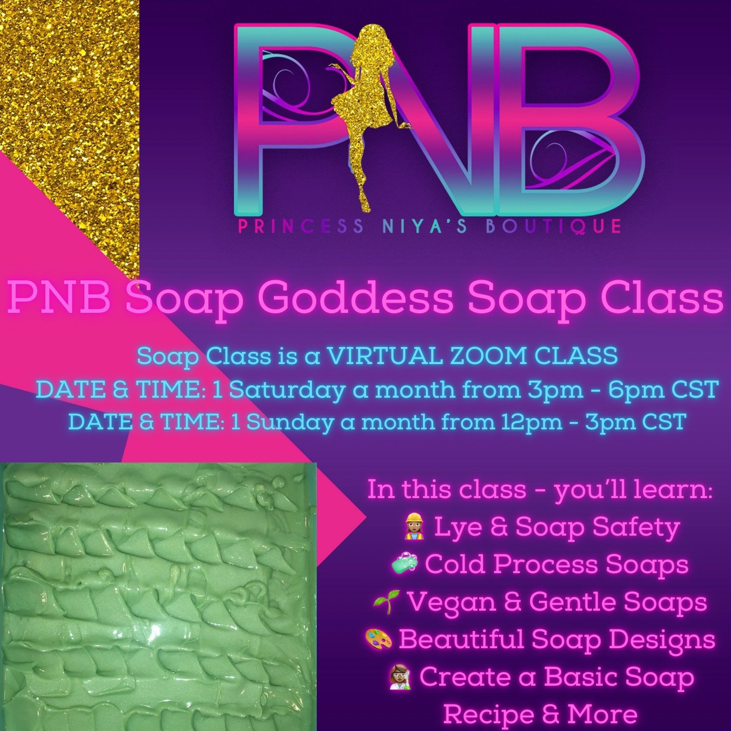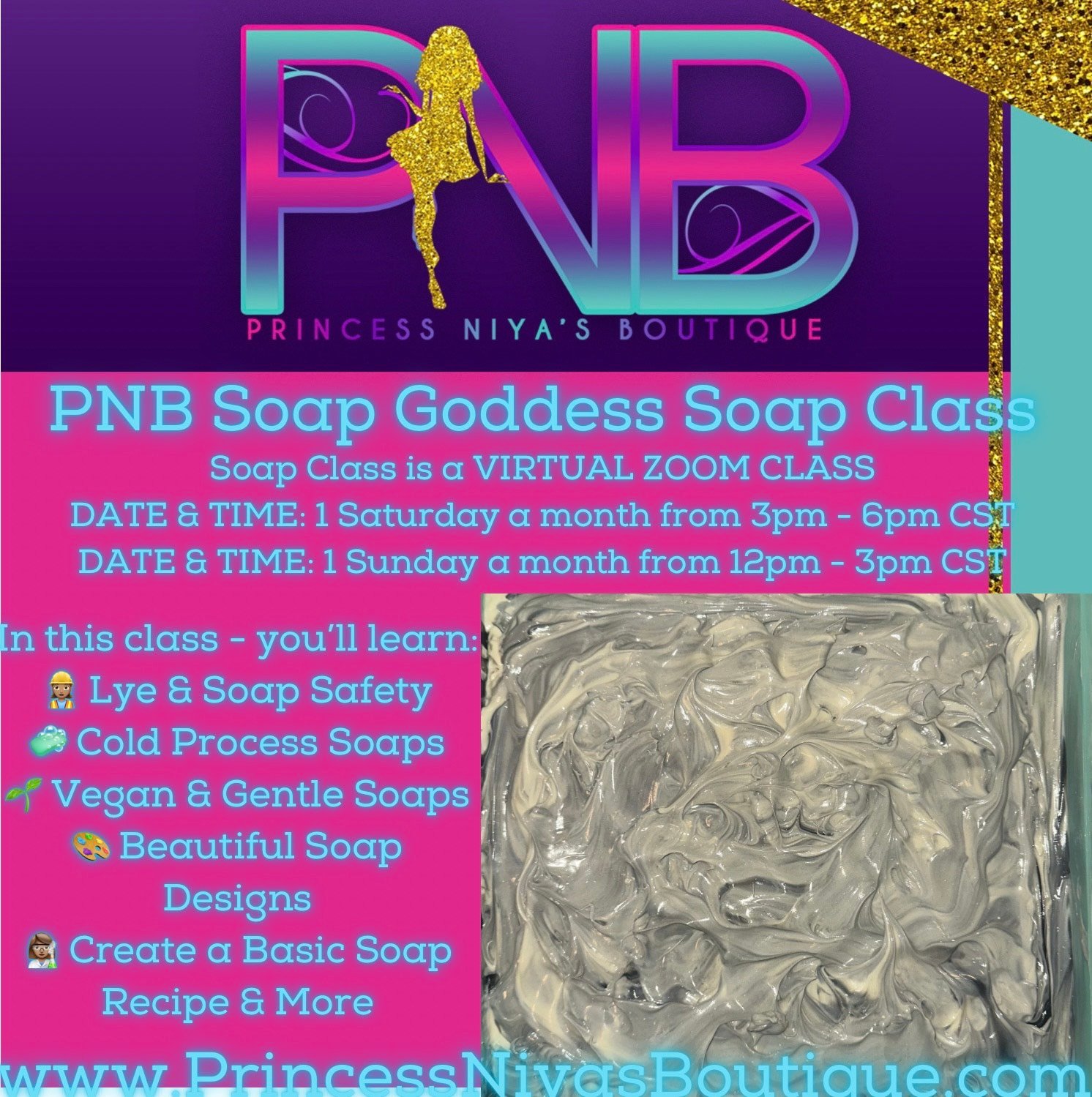 Our PNB Soap Goddess Soap Classes are VIRTUAL ZOOM CLASSES. We have 2 soap Classes per month (1 Saturday from 3pm - 6pm CST & 1 Sunday from 12noon - 3pm CST).