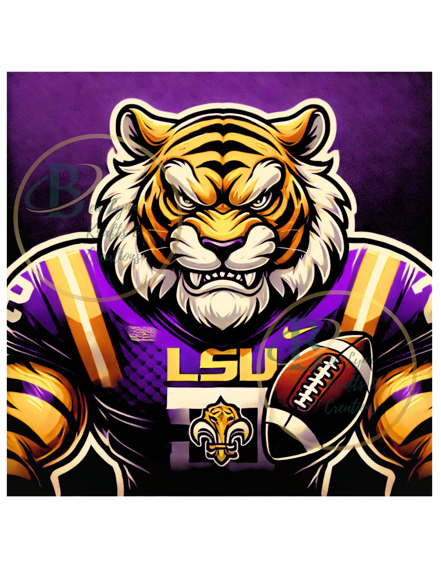 This vibrant and fierce transparent PNG image features Mike the Tiger, the official mascot of the LSU Tigers. Dressed in the iconic purple and gold football uniform, Mike the Tiger showcases his strength and determination, making it a perfect representation of LSU spirit. This item is a digital download that consists of a transparent PNG file. Upon completing the payment, you will gain instant access to the file for downloading. Please note that no physical items will be shipped to you.