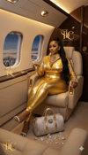 - Unified hairstyle, luxury detail, and matching gold bodysuit theme