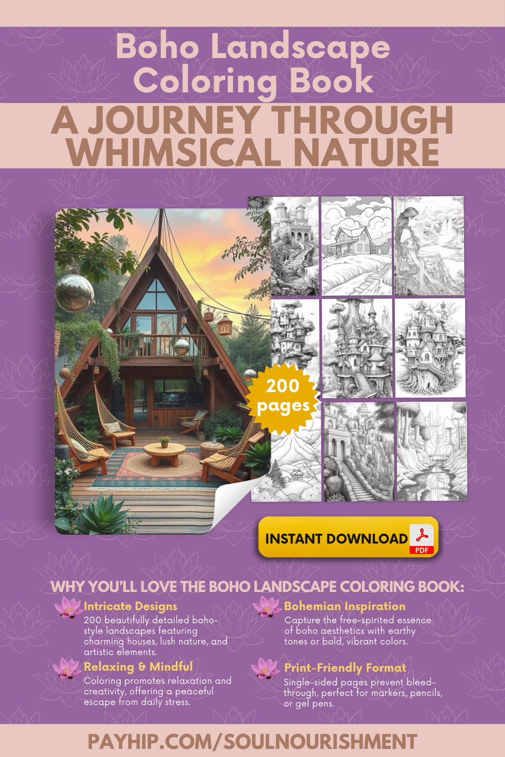 - 200 Enchanting Pages: A captivating collection of boho-inspired landscapes featuring cozy cabins, scenic mountain views, tranquil forests, and dreamy gardens—each page is a canvas for your imagination.